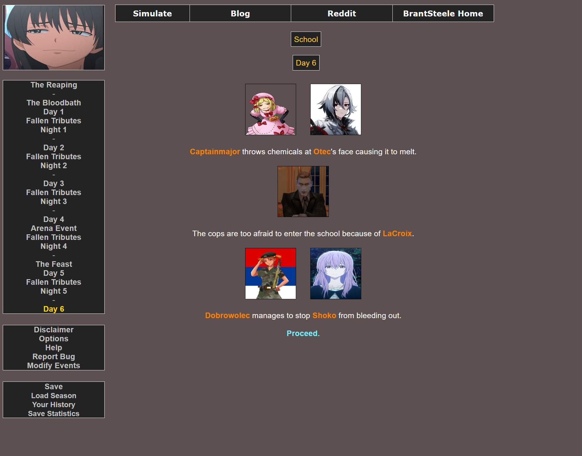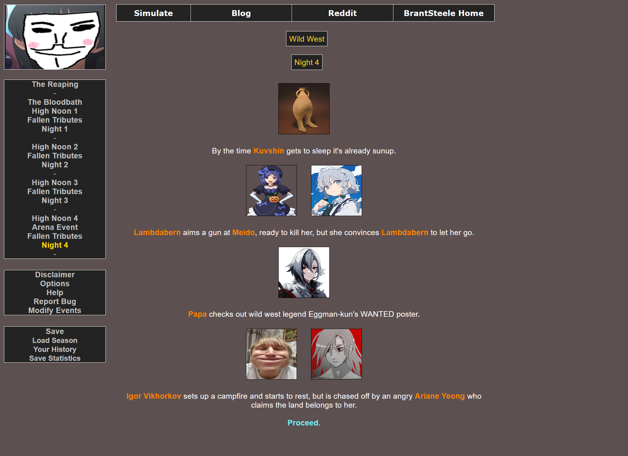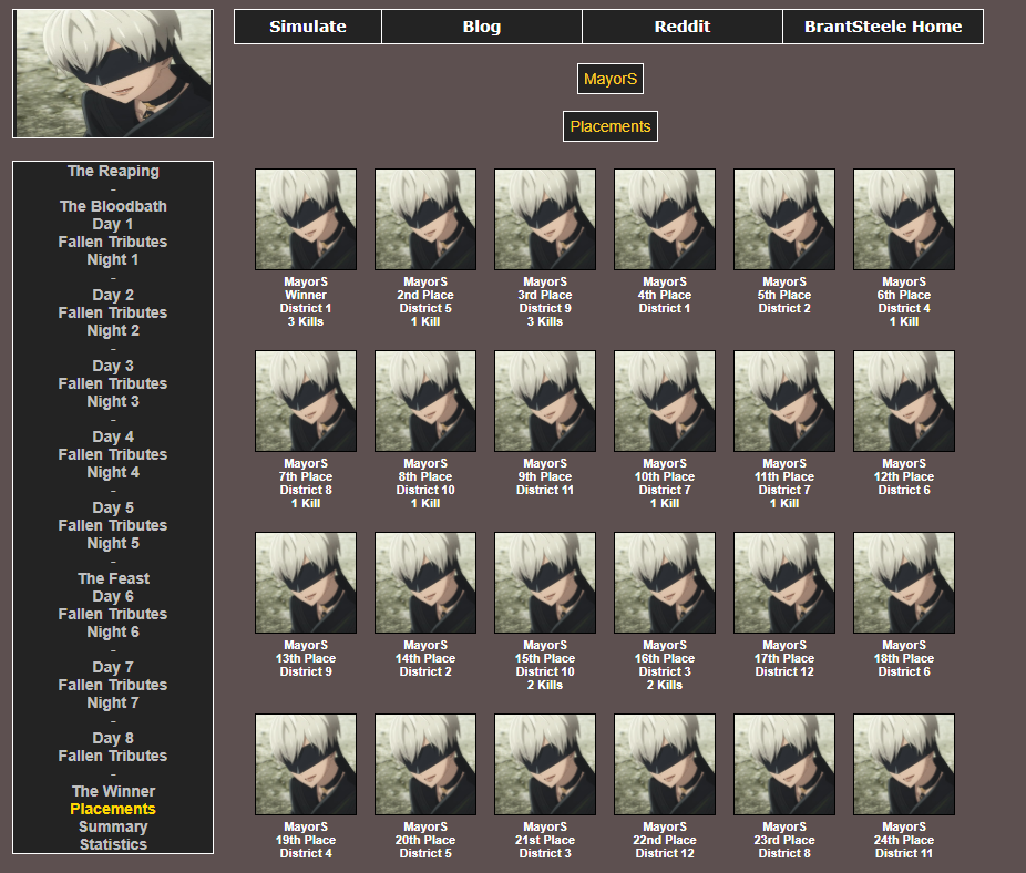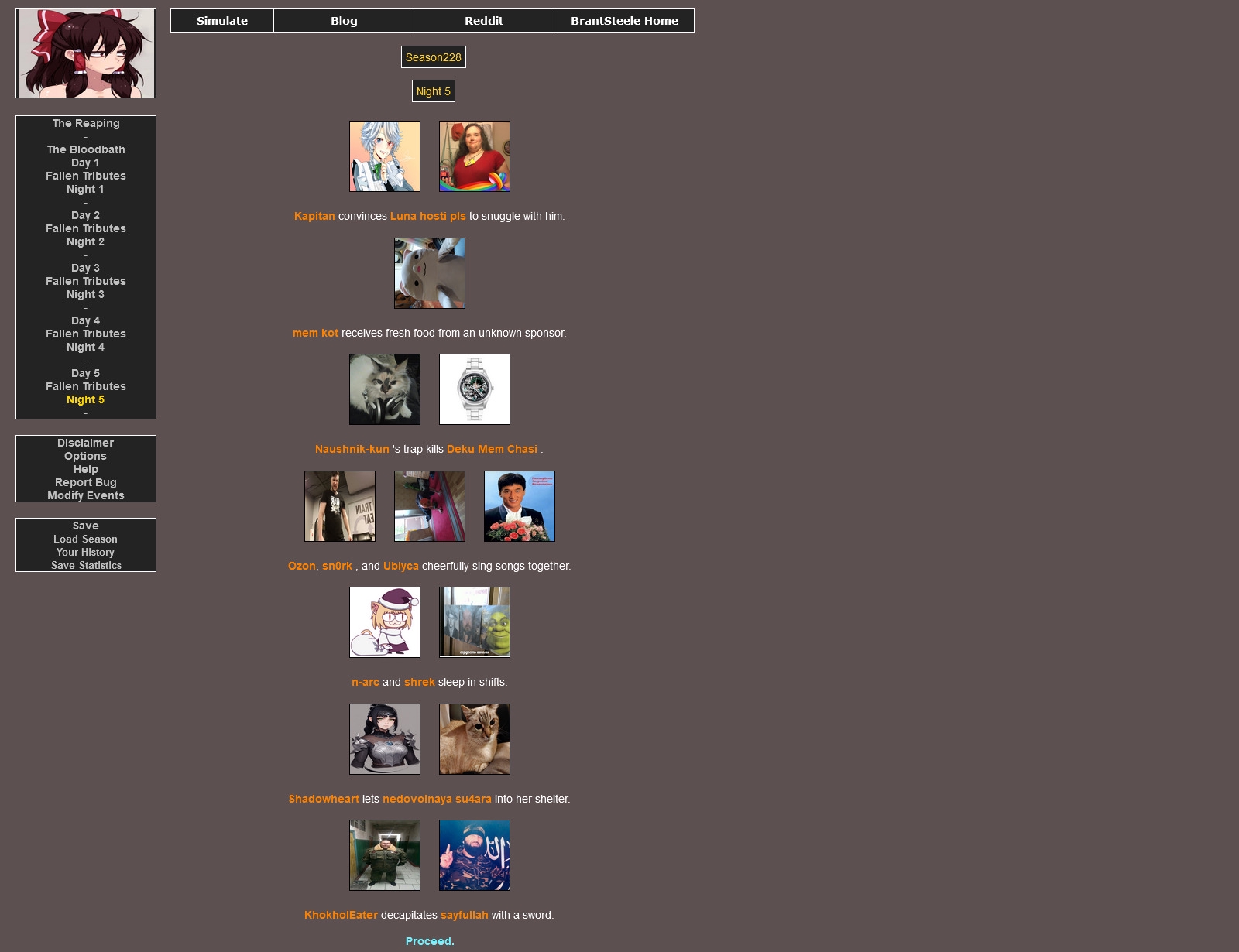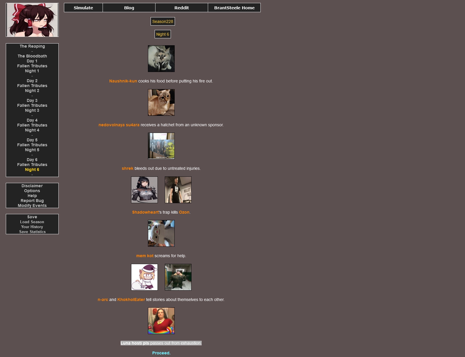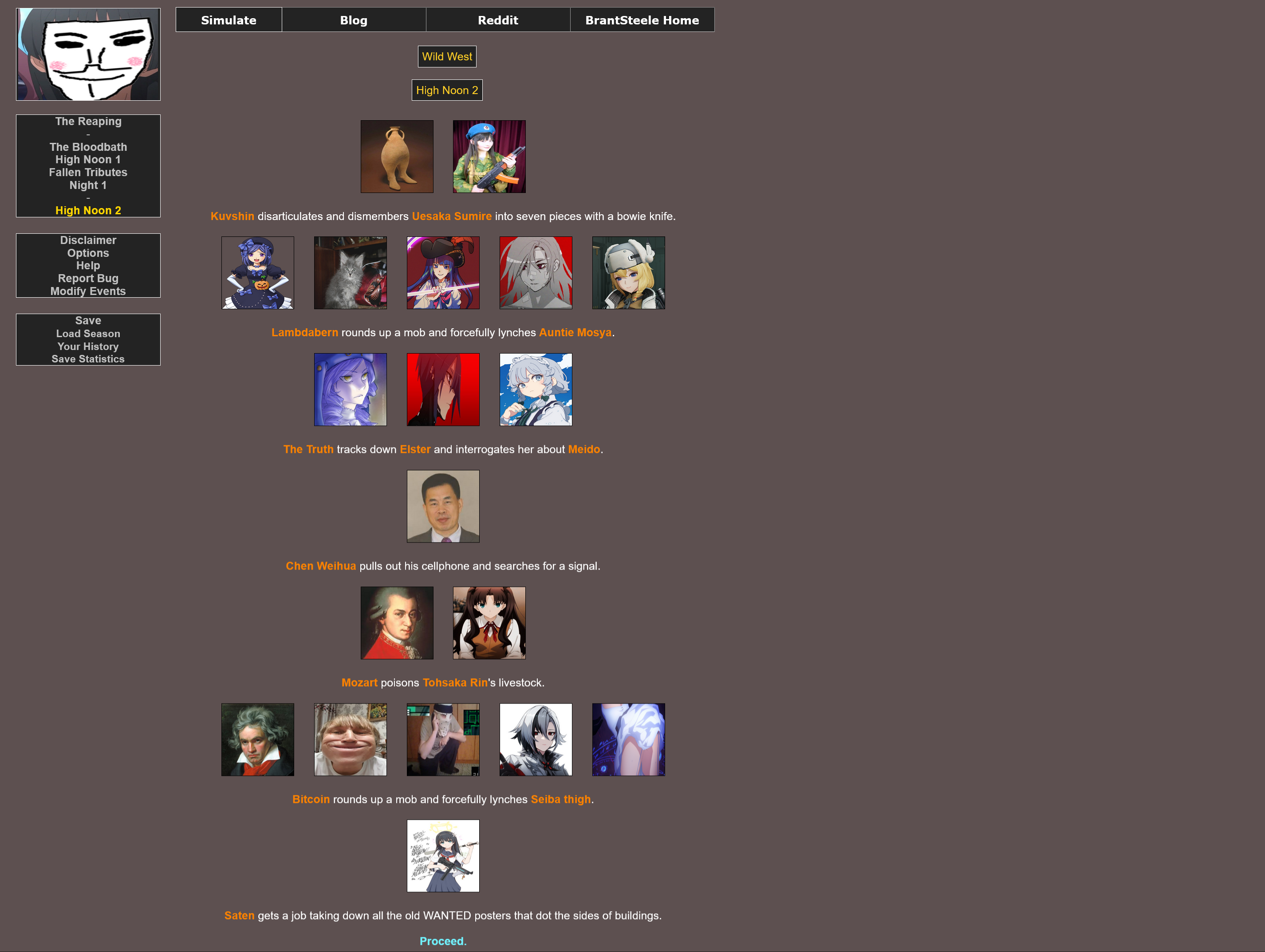 >>1536877 1. Ждёшь, когда хост даст команду на сбор персонажей. Например, как тут >>1536786 2. Вкидываешь в тред имя персонажа + его аватарку, как тут >>1536792 3. Запасаешься попкорном, ждёшь, когда наберётся 24 персонажа на игру в текущих полудохлых реалиях придётся ждать не один день. Затем наблюдаешь за тем, как твой персонаж пробивается к первенству в симуляции Голодных Игр. Ну или скорее получает перо в бочину на первый-второй день. 4. ??? 5. PROFIT!