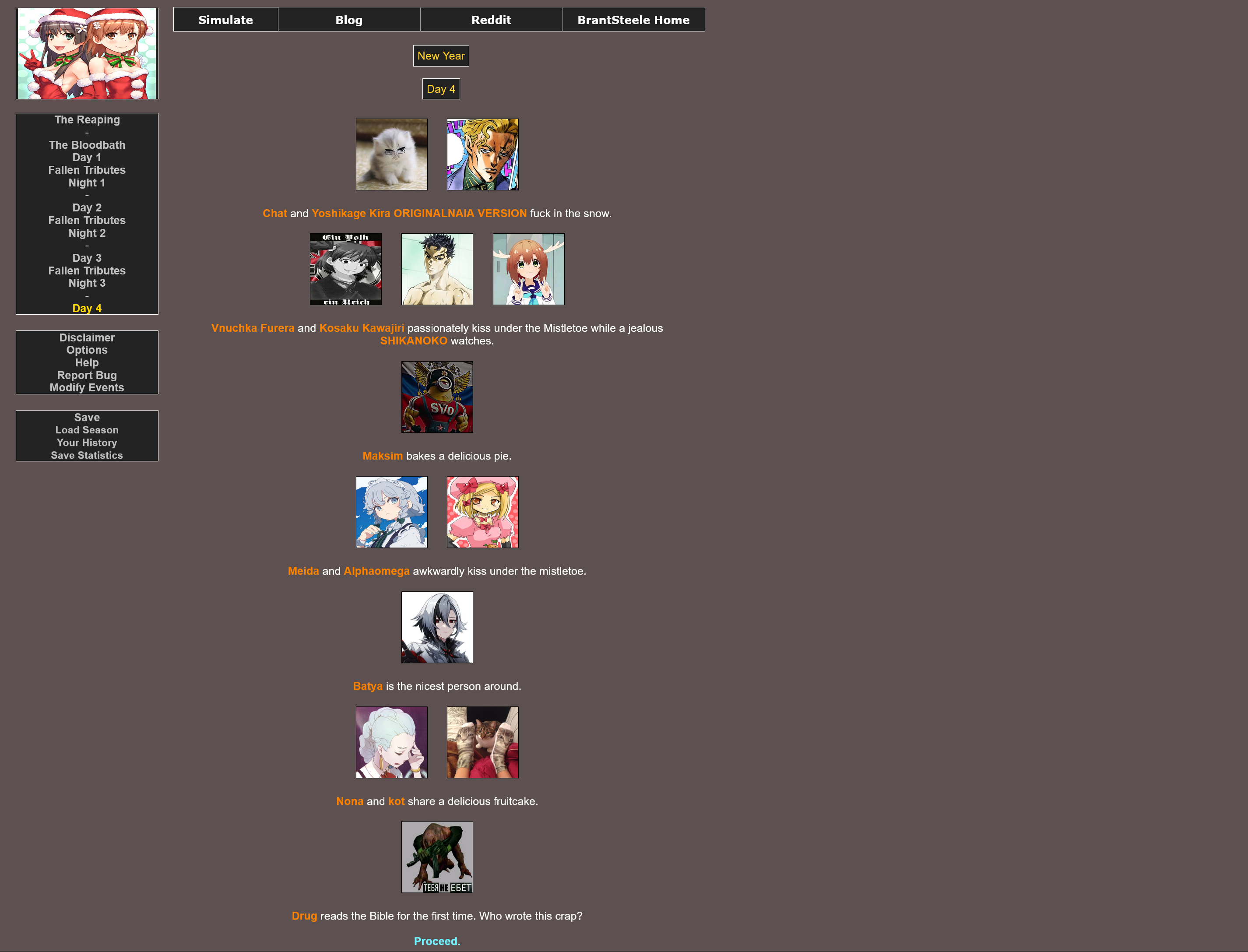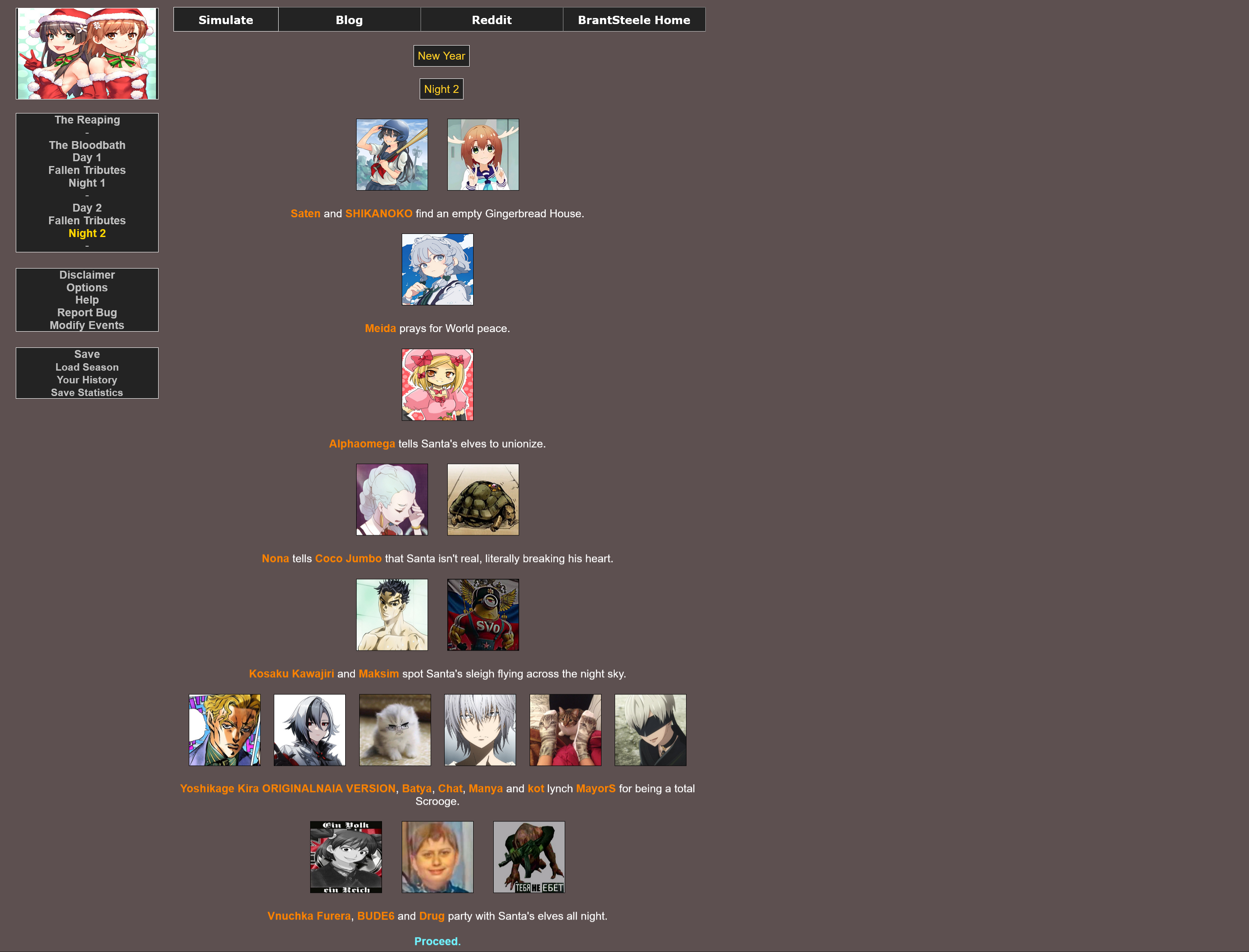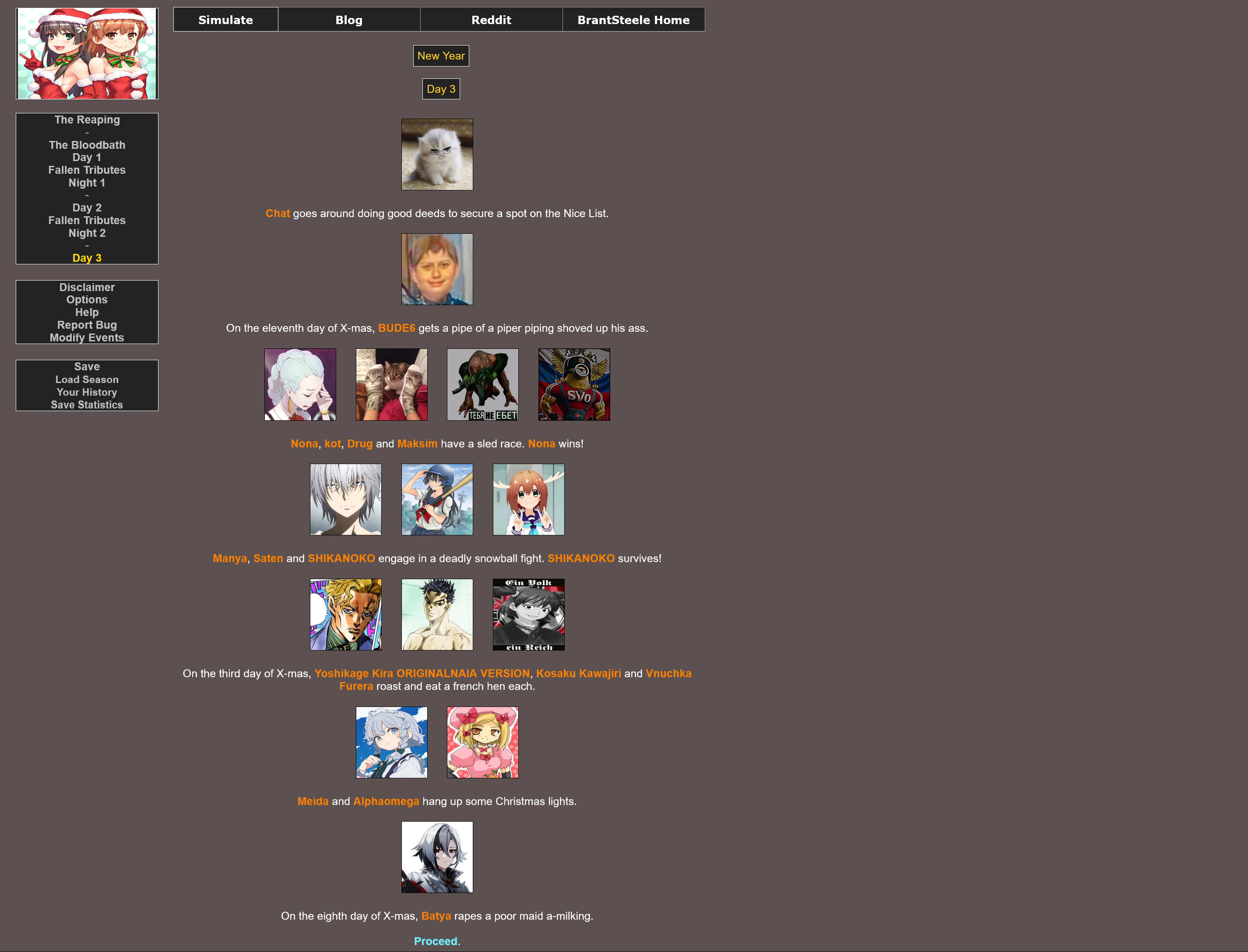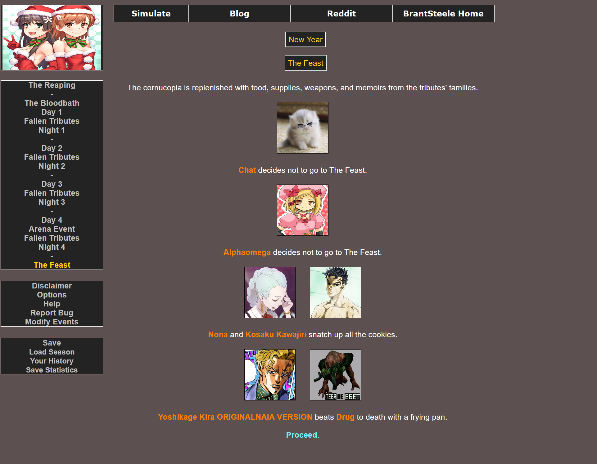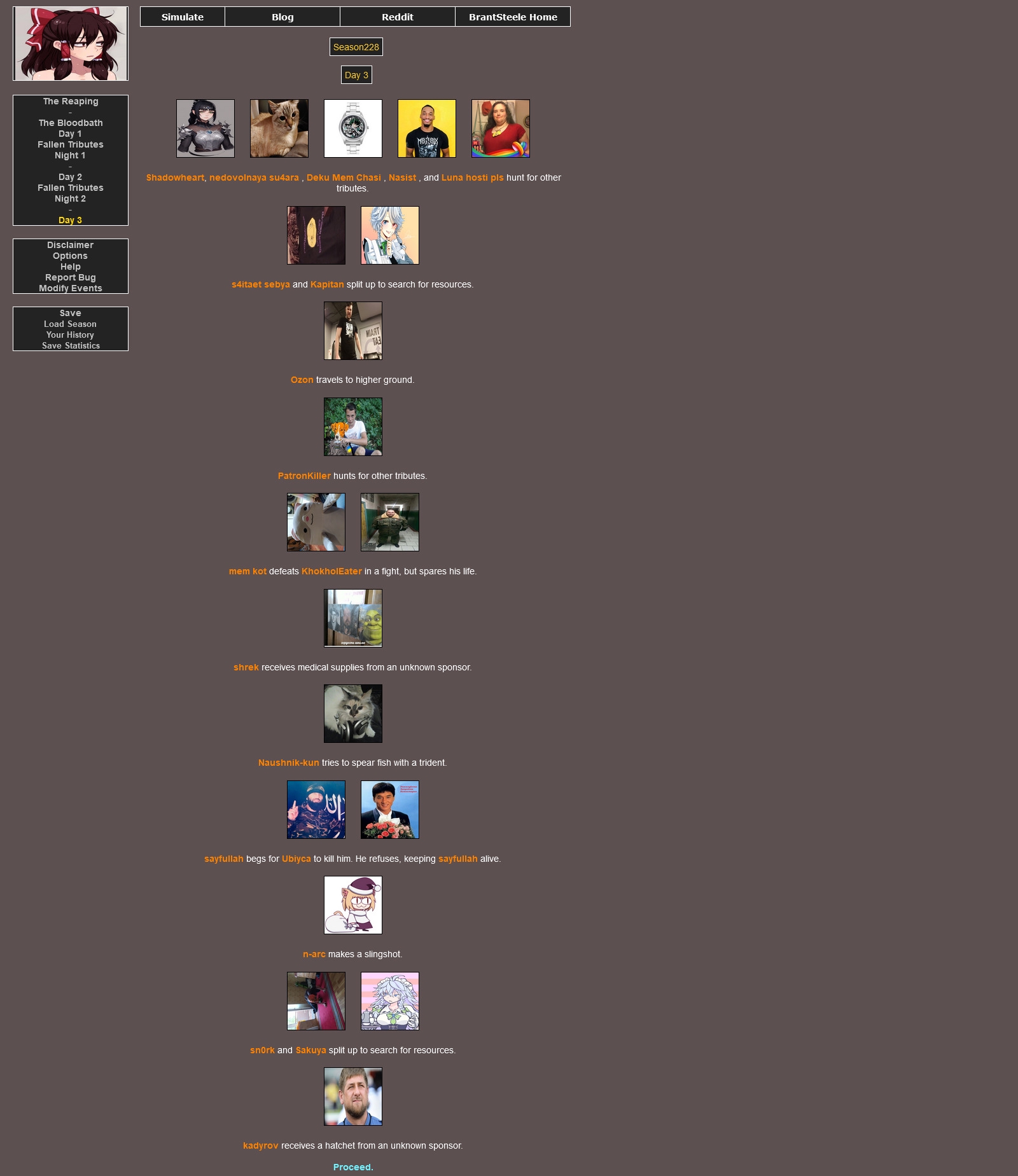 >>1536877 1. Ждёшь, когда хост даст команду на сбор персонажей. Например, как тут >>1536786 2. Вкидываешь в тред имя персонажа + его аватарку, как тут >>1536792 3. Запасаешься попкорном, ждёшь, когда наберётся 24 персонажа на игру в текущих полудохлых реалиях придётся ждать не один день. Затем наблюдаешь за тем, как твой персонаж пробивается к первенству в симуляции Голодных Игр. Ну или скорее получает перо в бочину на первый-второй день. 4. ??? 5. PROFIT!