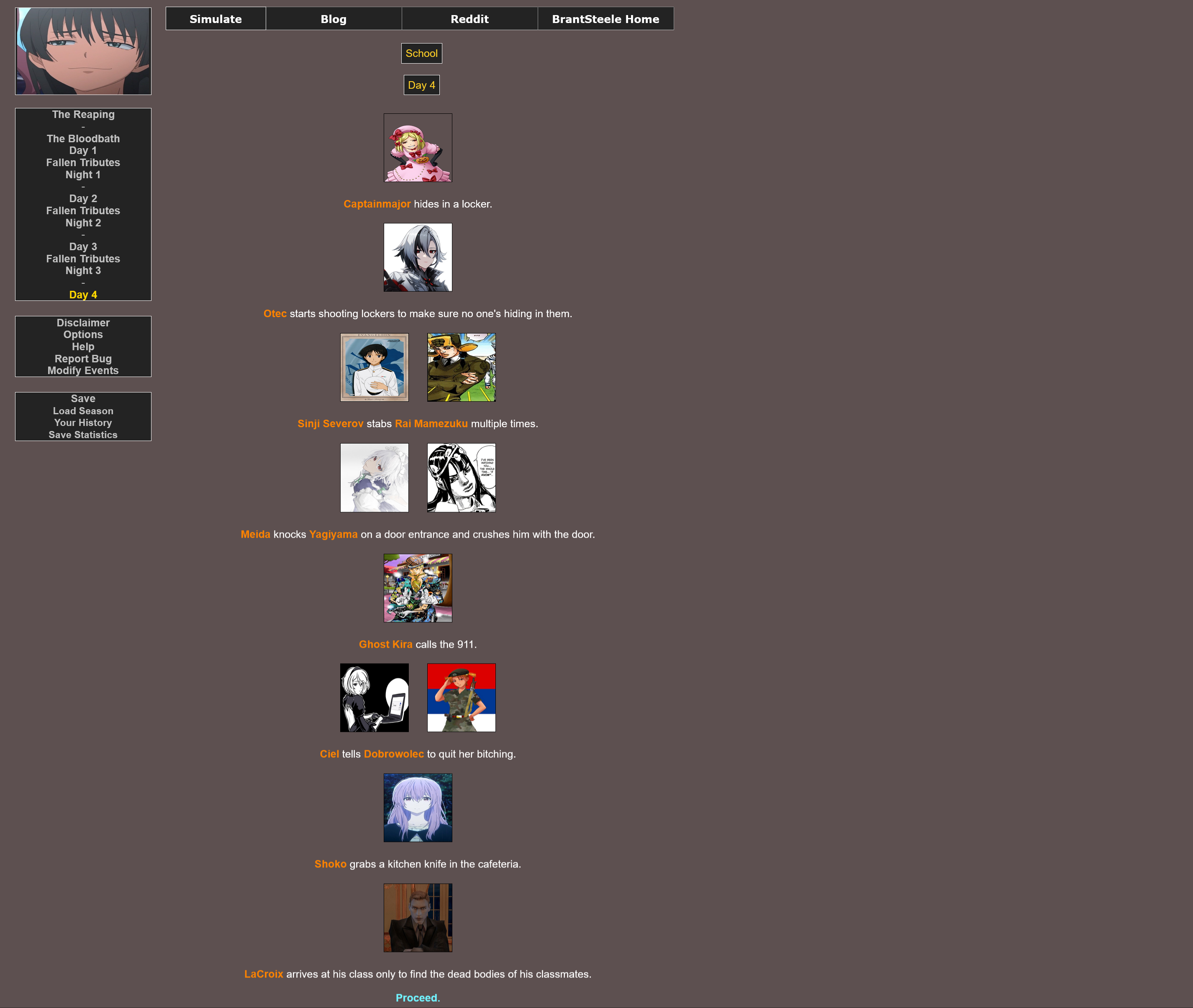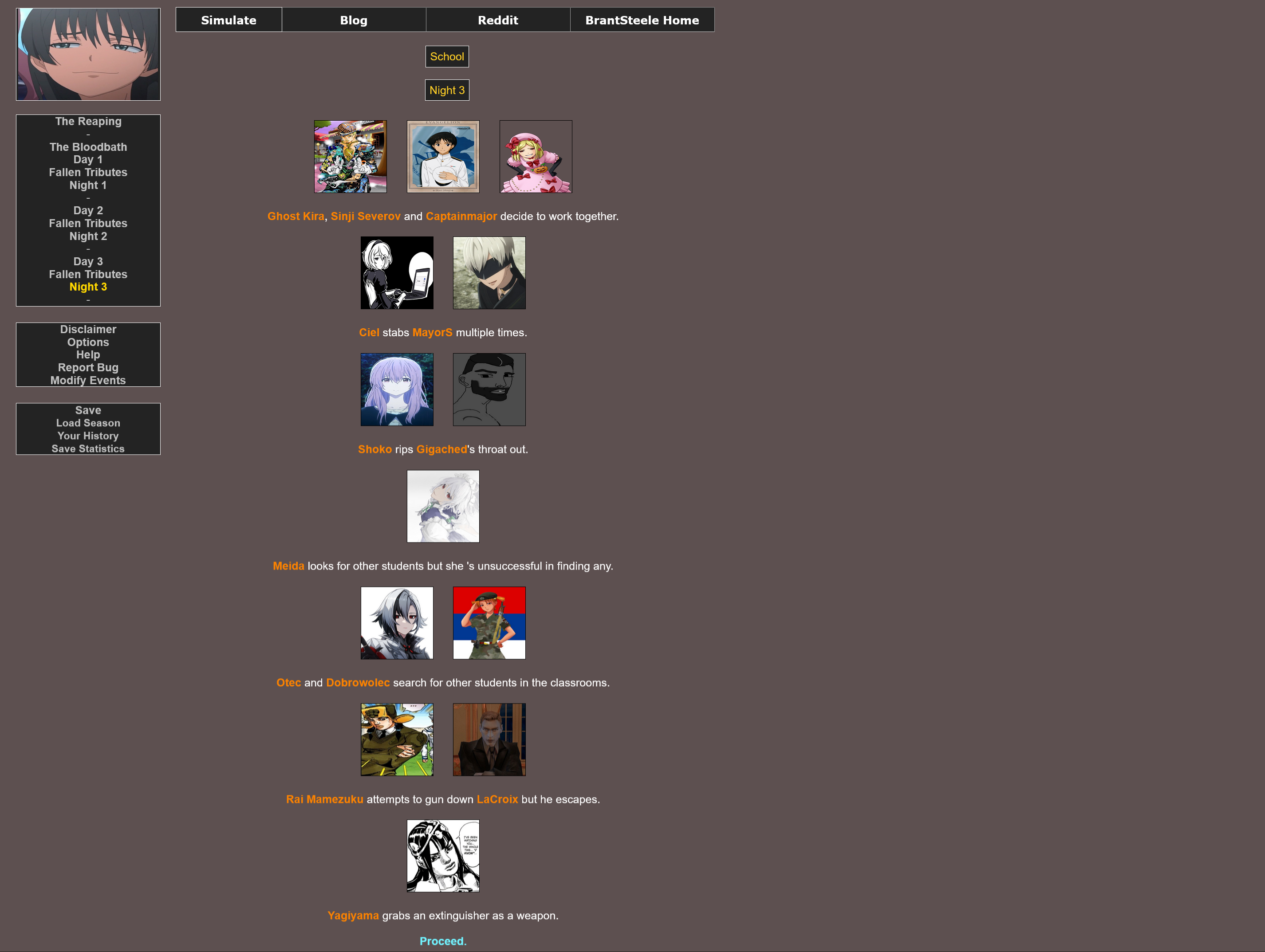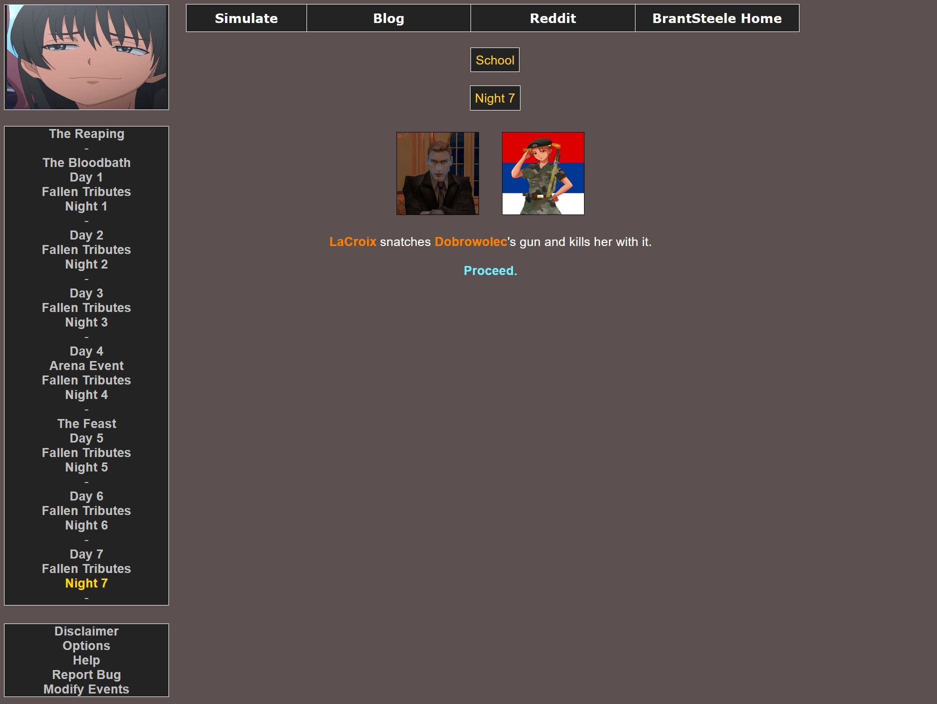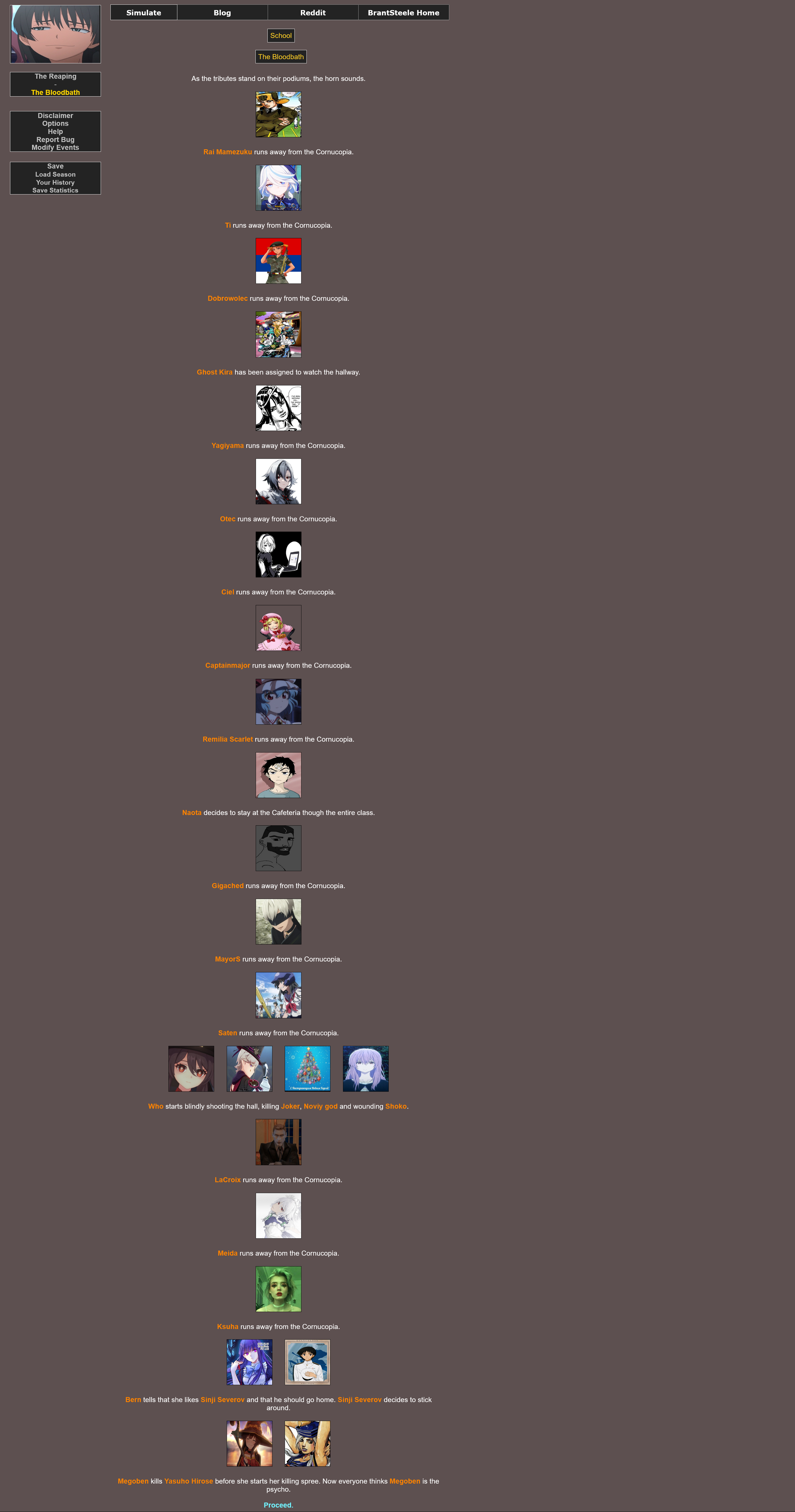 Мистическим образом(здесь явно задействовано могущественное таинство), горничная из особняка Тоно попадает в Голодные игры. Даже в такой ситуации, она остается оптимистичной, в её груди греется надежда вернуться обратно на службу, ведь кто еще будет заваривать чай госпоже Акихе?!