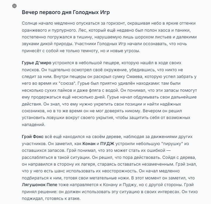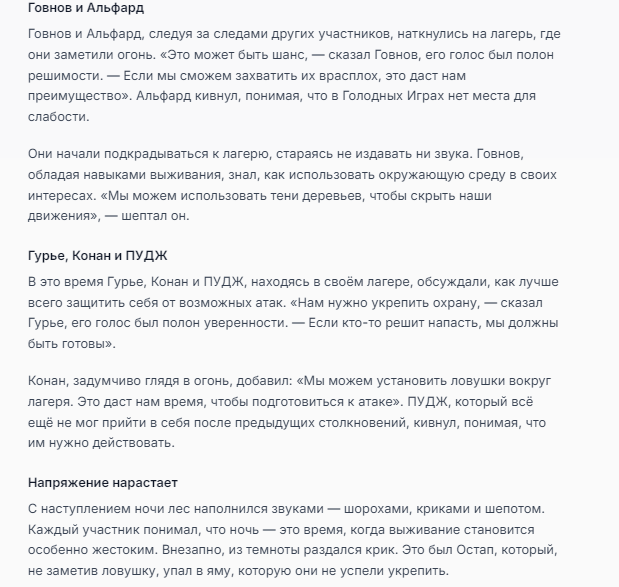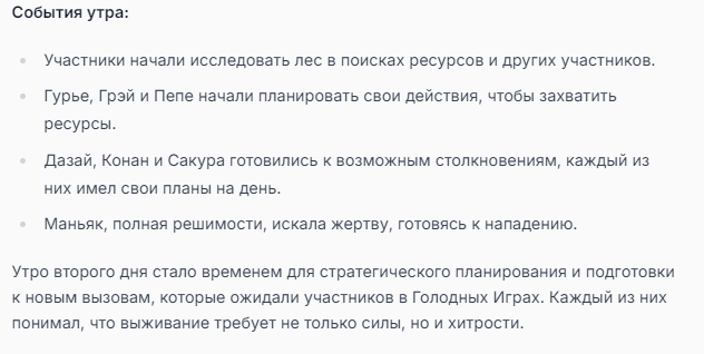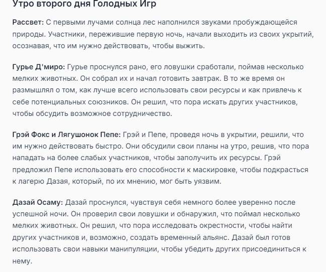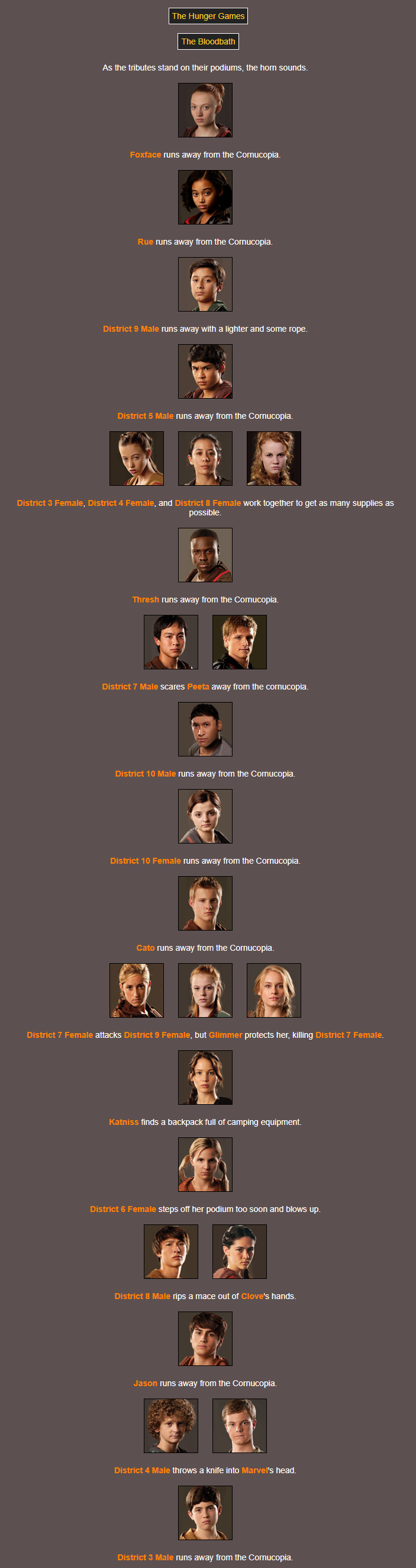 Дамы и господа, добро пожаловать на невероятное шоу "Голодные Игры"! С вами ваш ведущий, и мы готовы к захватывающему первому дню кровавого сражения!
