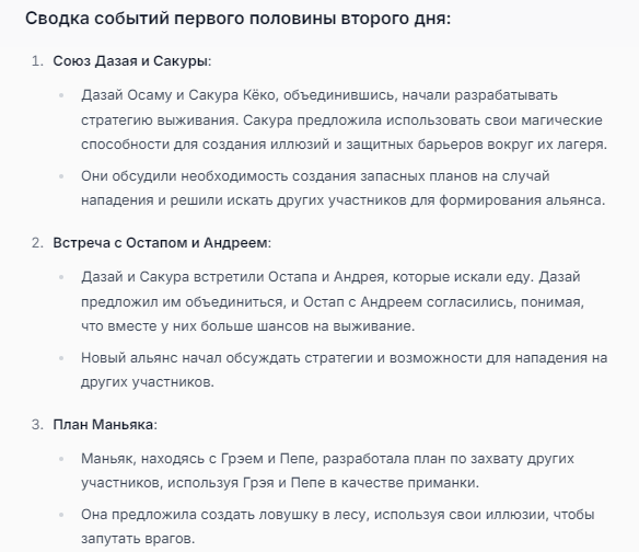 >>1541378 >Не хотелось мешать вам с Сэйбой, да и инициативу проявлять не люблю. Эх, ну что с тобой поделаешь. >Ага, конечно, вернется он. На новый год даже не зашел поздравить, о чем тут говорить? Причём не первый Новый год пропускает. Честно говоря, тут я с тобой соглашусь - скорее голодач воспылает жизнью образца 2016 года, чем вернётся Сэйба. >А я вот давно не слушал. Как это мы удачно с тобой собрались, получается, хорошую музыку вот вспомнили. Держи и от меня трек: https://youtu.be/xiHA7Aw2GiE?si=qCkp9IIGVWtAmE_9