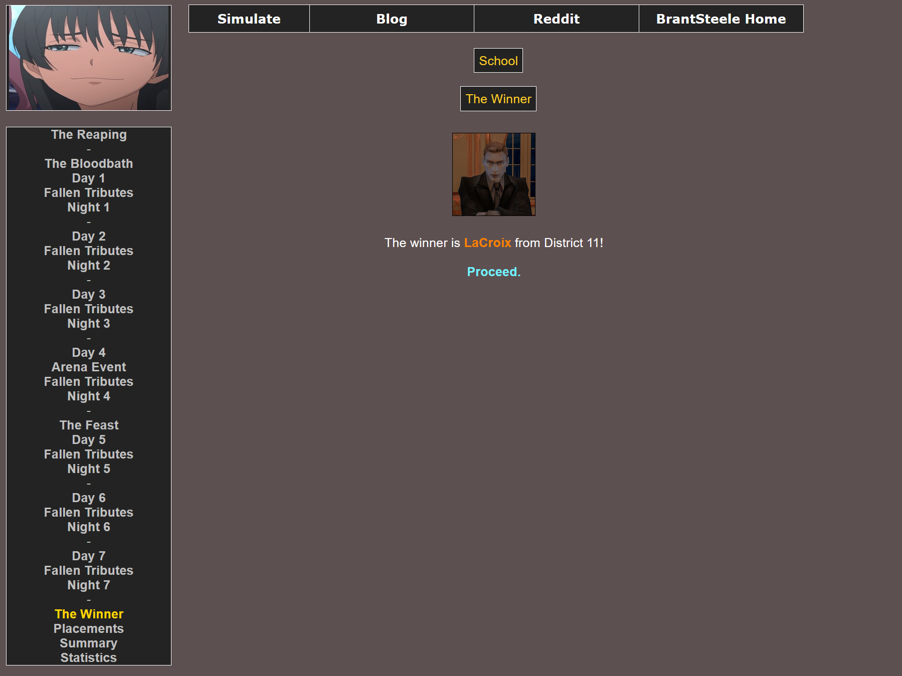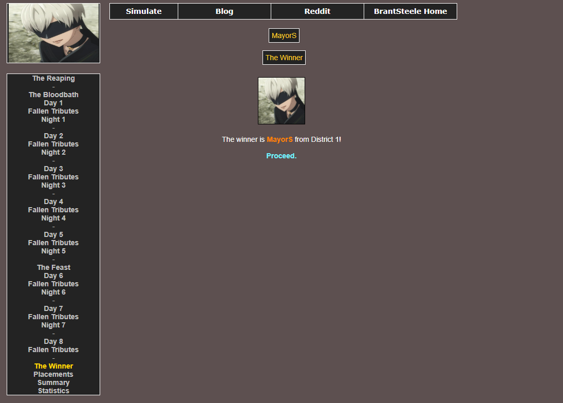 Младший сын Устрашителя. Вызвался на игру добровольцем, чтобы отомстить за своих отца и дядю, погибших в прошлых Голодных Играх в /b/. Судьям и организаторам Игр не рекомендуется подходить к нему близко. Умён и хитр. Характер стойкий, нордический.