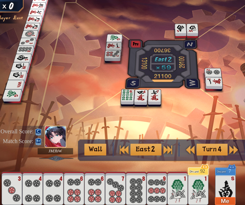 >>1584550 C и C+ у всех Но по-моему какую то хуйню бот советует. Например не сбрасывать зеленого дракона когда в дискарде уже два дракона чтобы что? Семь пар собрать? Или типа чтобы когда нибудь потом безопасно скинуть этого дракона? Или вот зачем скидывать пару ради призрачного якухая когда один тайл нужный для него уже скинули, тогда уж логичнее сбрасывать тройку если прям хочется в якухай упороться вместо пары.