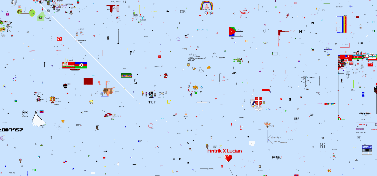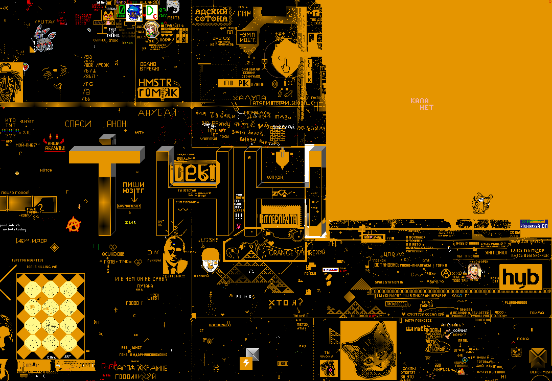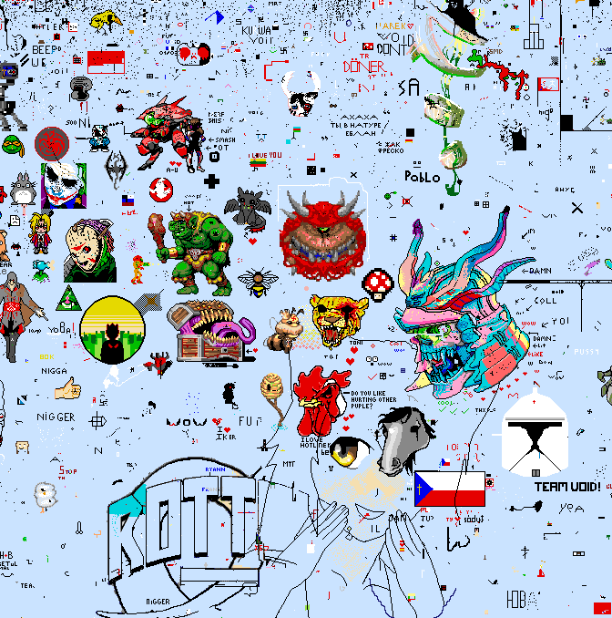 Void: КД по стандарту 7 секунд(если перекрыть чужой пиксель) и 4 секунды (если перекрыть пустое пространство). С определённым интервалом проходит ивент под названием - Void. В случайной части карты появляется эта залупа и начинает раскручивать свой маховик. Координаты на это чудо любезно дают в чатике. Чтобы победить её - нужно продержаться определенное время и замедлить разрастание пустоты. Для замедления следует ставить либо белые в океане, либо светло-голубые (на суше) пиксели. Если пережить выброс, то кд уменьшается вдвое: 4 и 2 сек. соответственно.