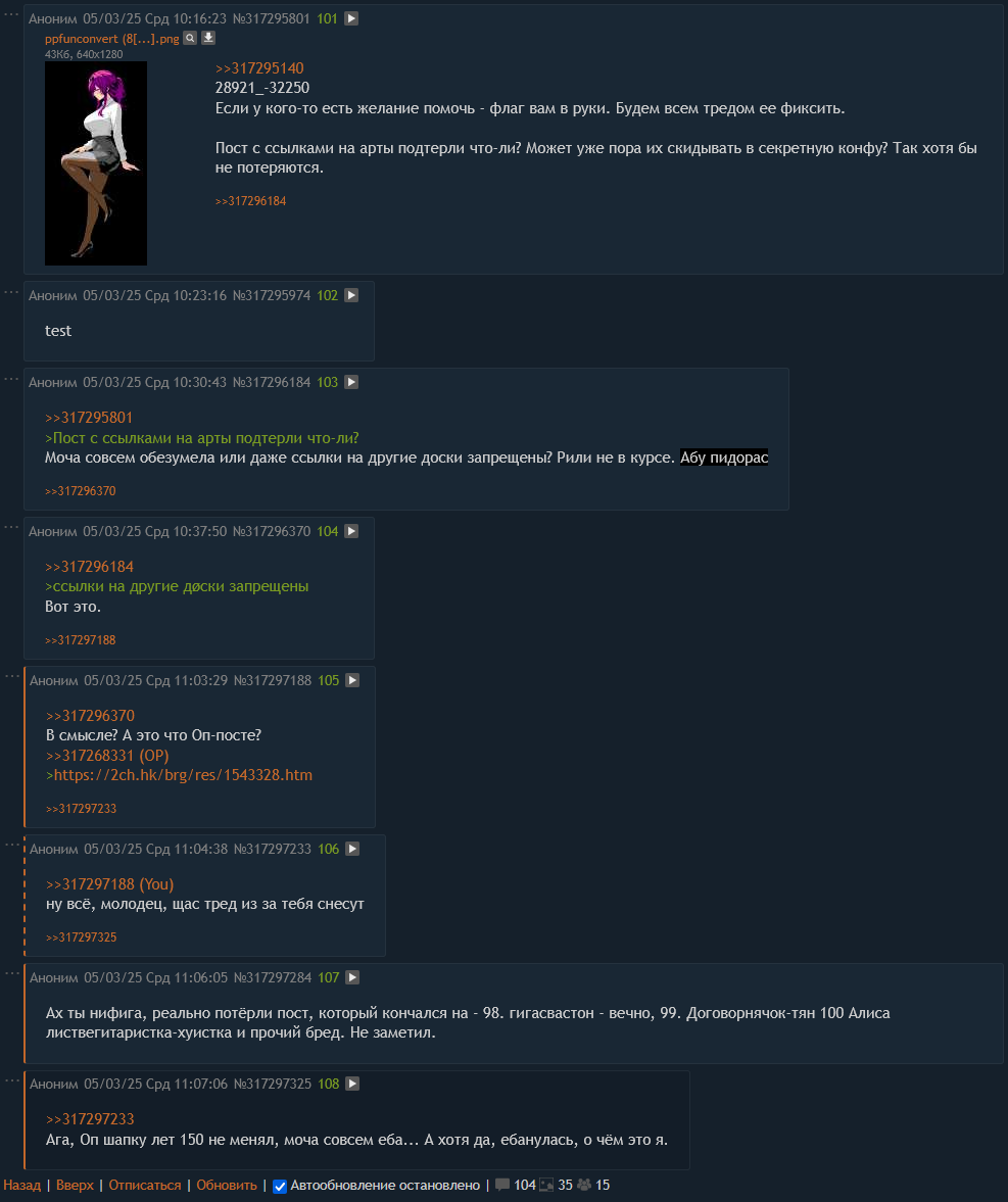 Блять, ну вы чё? В самоорганизацию не смогли? Извините за долгое отсутствие, все объясню потом, в крации - форс мажор. https://2ch.hk/b/res/315257024.html оп