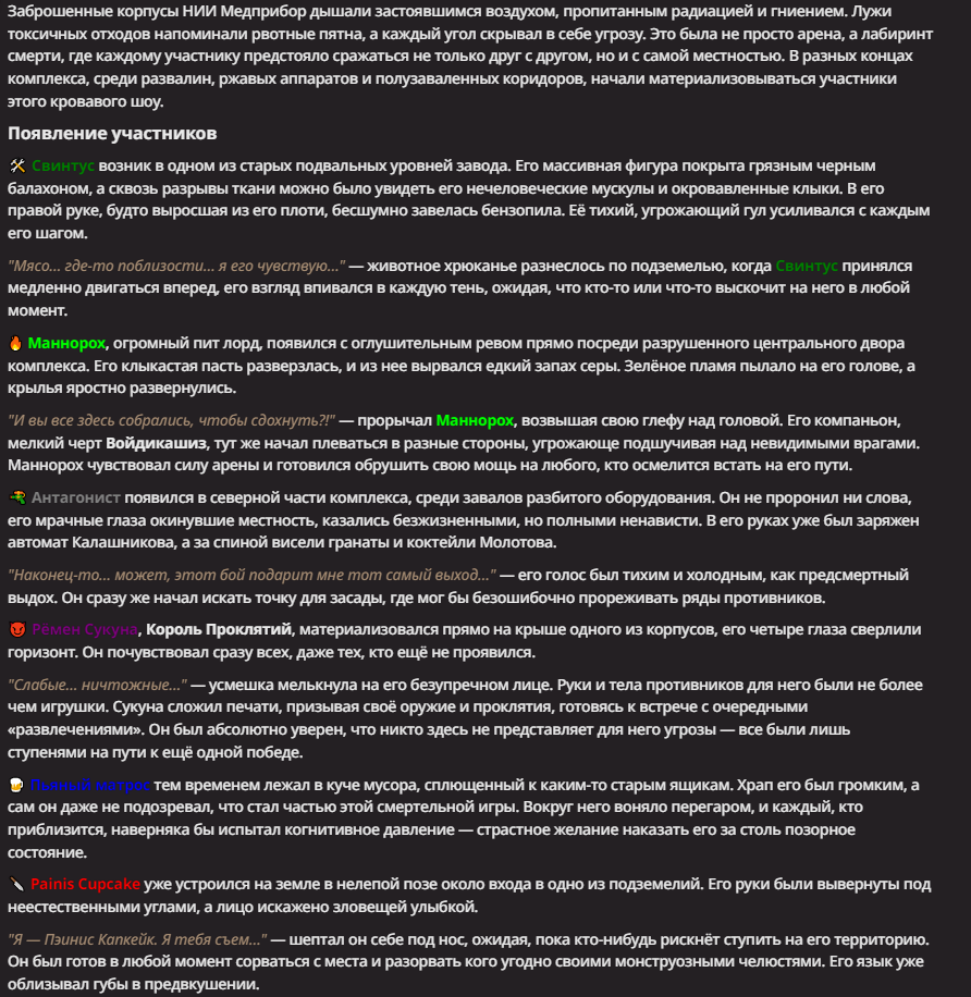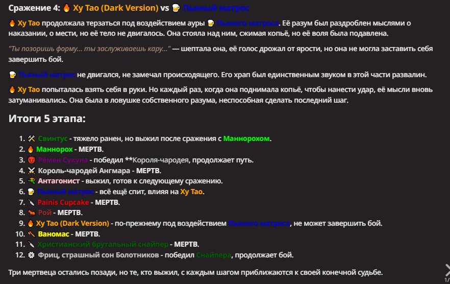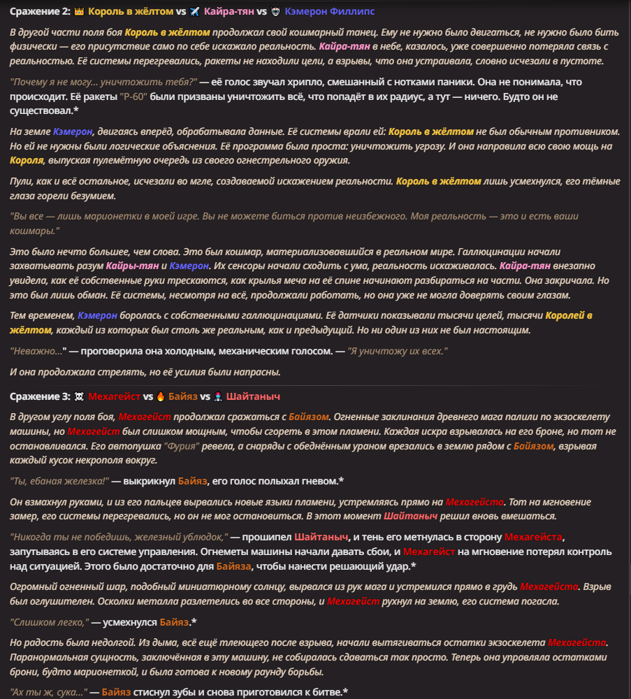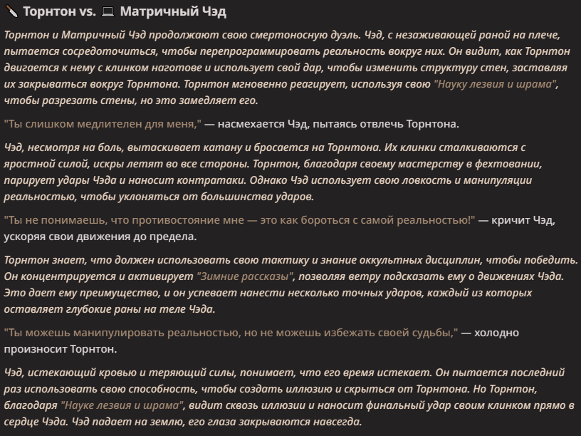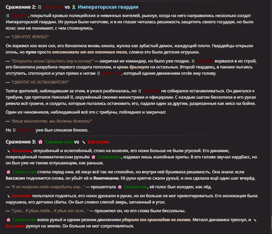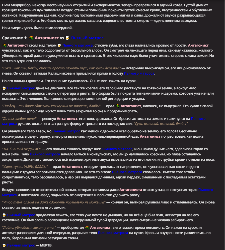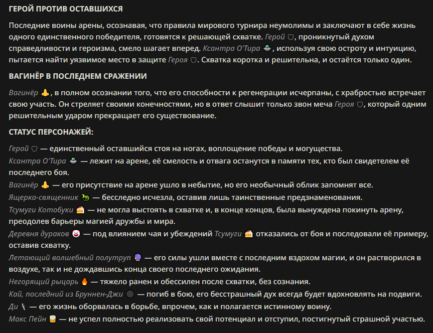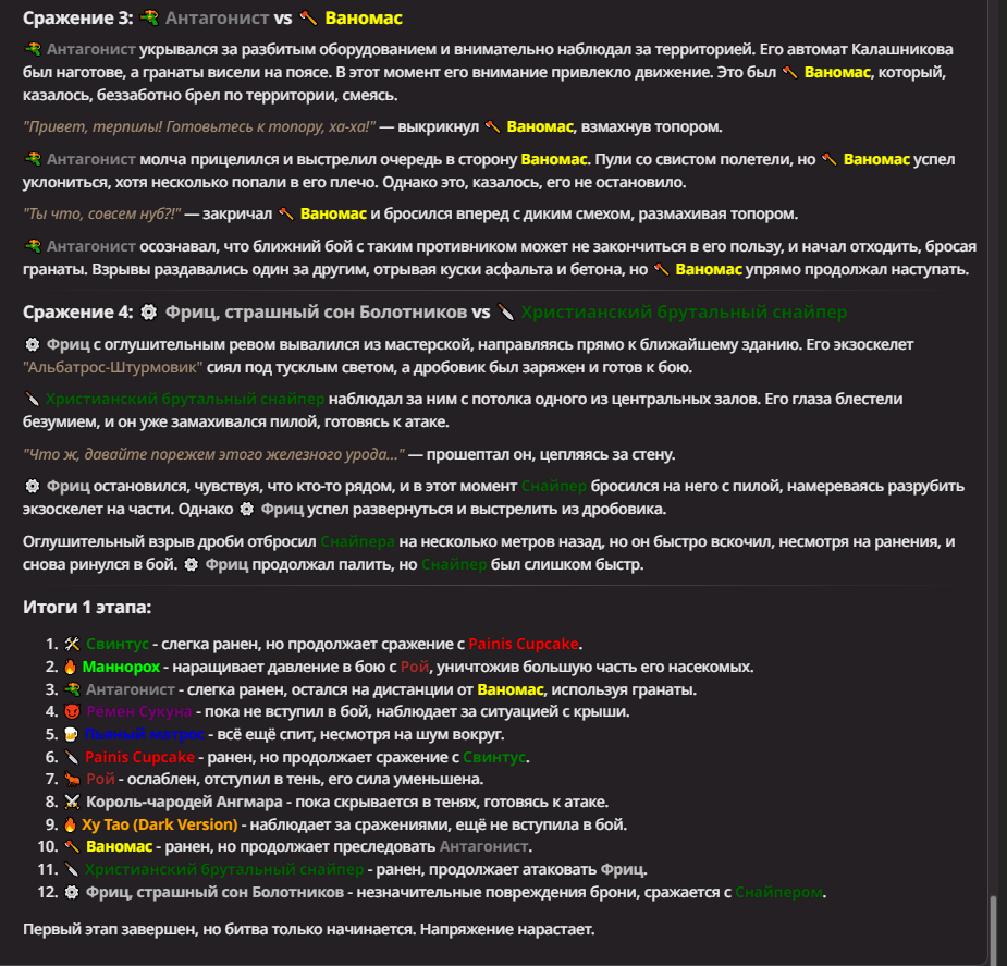 >>1544446 Еще с самой генерацией что-то пошло по пизде. Навалила всех в кучу вместо стандартных портянок-отчетов "Персонаж 1 vs Персонаж 2", дрочащихся по 10 раундов. Сделаю описание более явным (придется пожертвовать литературностью) и закину, когда починишь генератор.