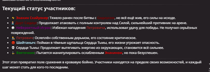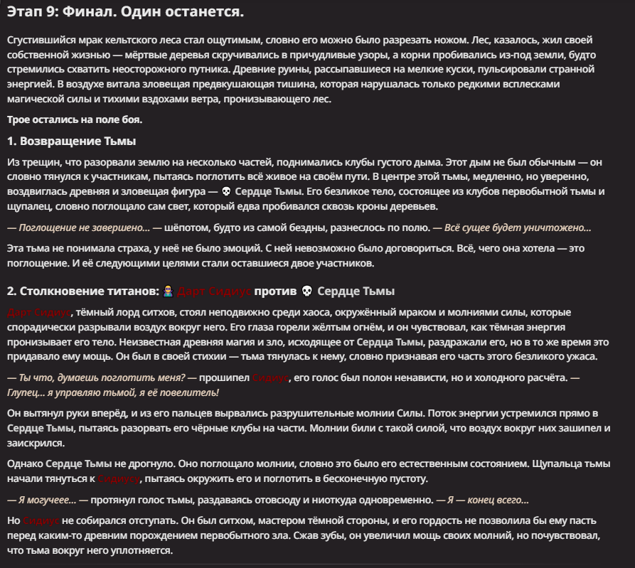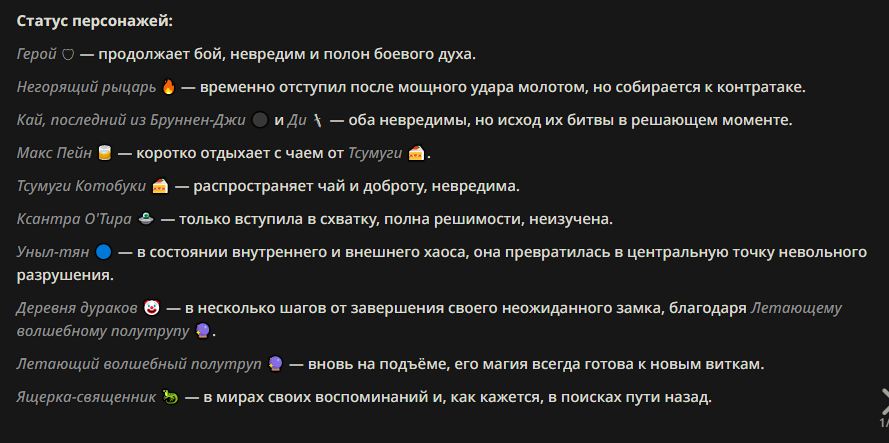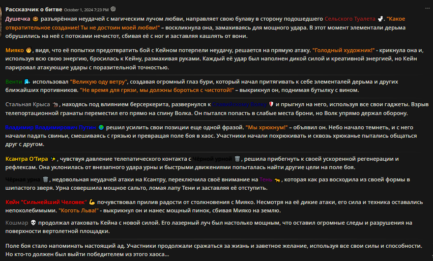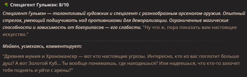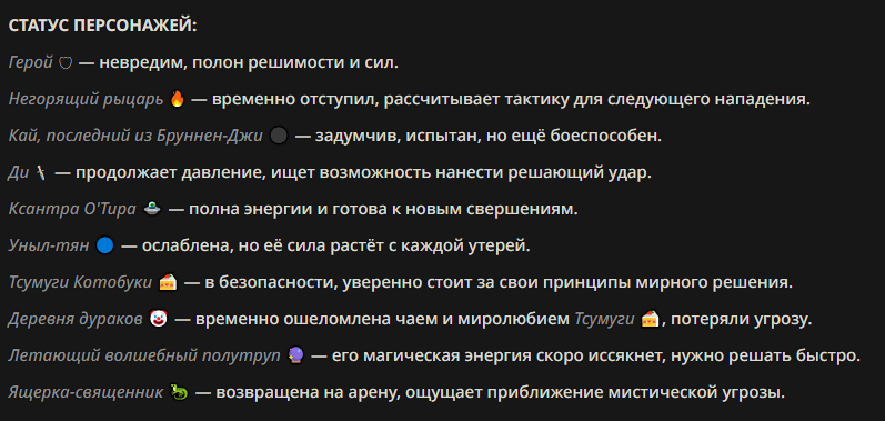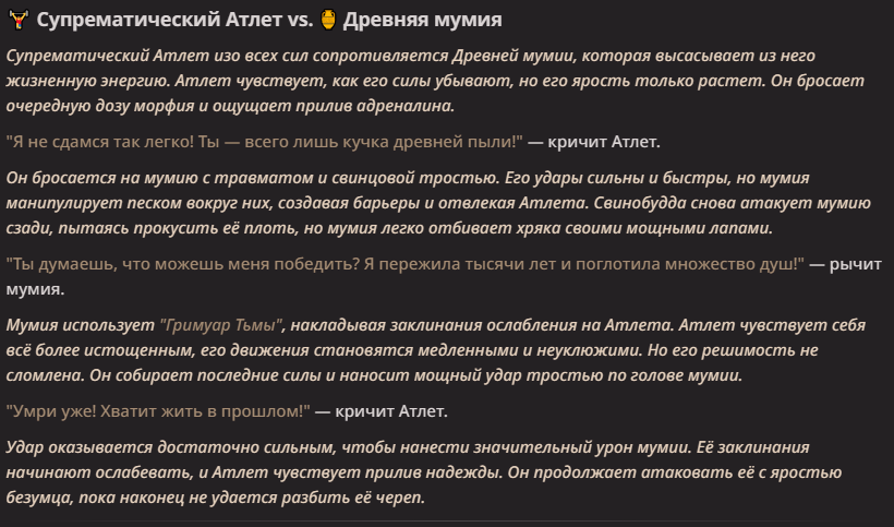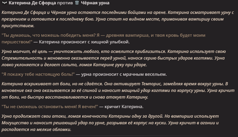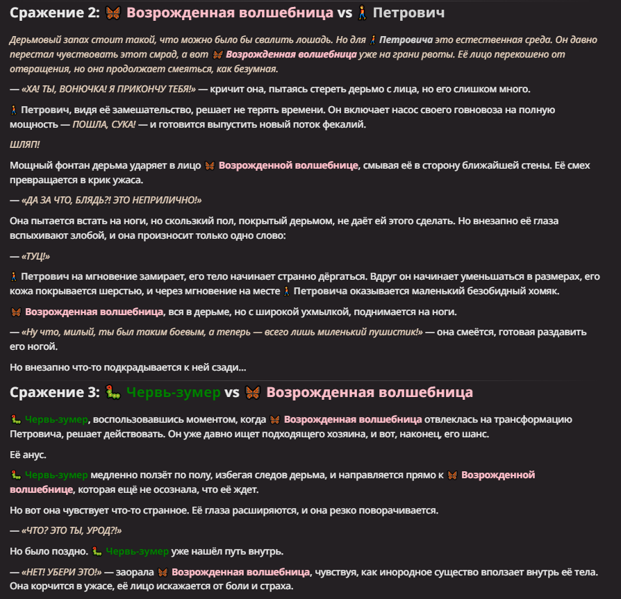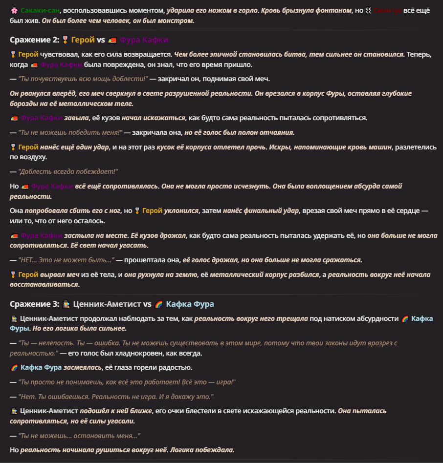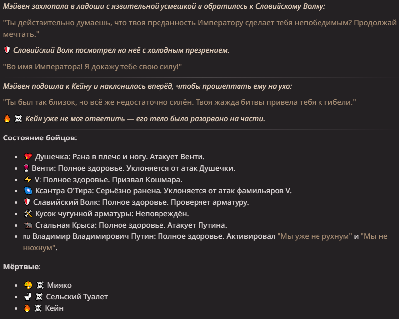 >>1544446 Еще с самой генерацией что-то пошло по пизде. Навалила всех в кучу вместо стандартных портянок-отчетов "Персонаж 1 vs Персонаж 2", дрочащихся по 10 раундов. Сделаю описание более явным (придется пожертвовать литературностью) и закину, когда починишь генератор.