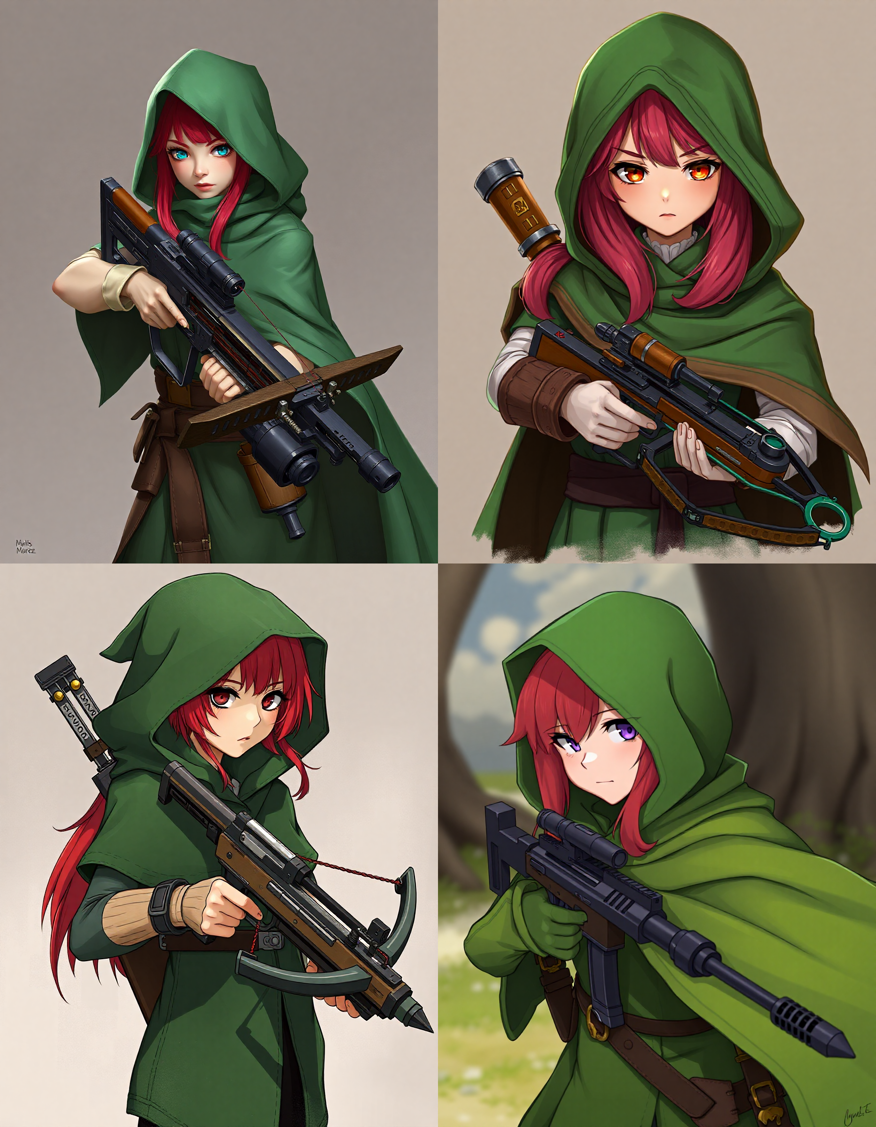 >>1544481 >Девушка в зеленом плаще с капюшоном и рыжими волосами, вооруженная автоматическим арбалетом Какой-нибудь стиль(аниме, реализм, или что-то еще) или фон нужны?