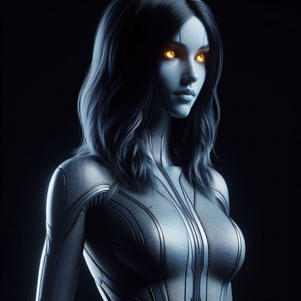 >>1544408 ""A tall, slender woman with pale, glowing gray skin, slightly luminous in the dark. She has hypnotic amber eyes that appear to glow, as if shining in infrared light. Her black hair, with subtle silver strands, falls in soft waves to her shoulders. She's wearing a sleek, form-fitting suit made of flexible armor, designed to protect her from radiation and minor injuries, with multiple pockets and pouches for carrying tools, artifacts, and weapons. Realistic style, detailed textures, cinematic lighting, dark and mysterious atmosphere, highly detailed face, soft reflections on her armor, subtle glowing effects on her skin and eyes. Ultra-realistic, 4K resolution, high detail.""