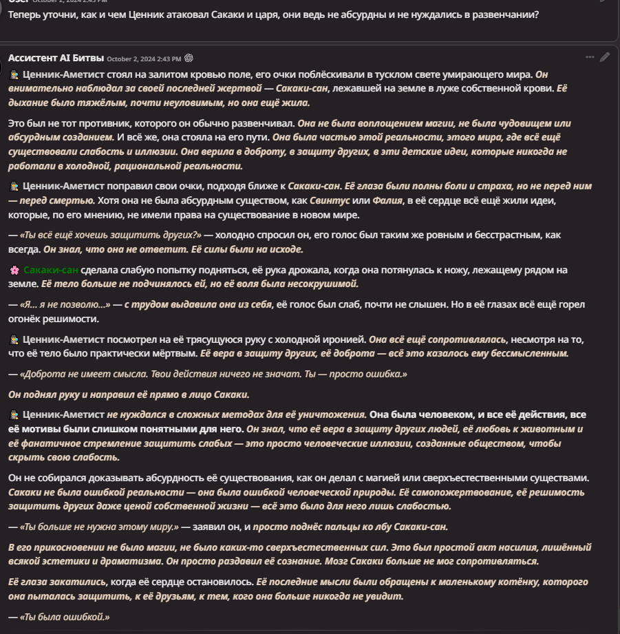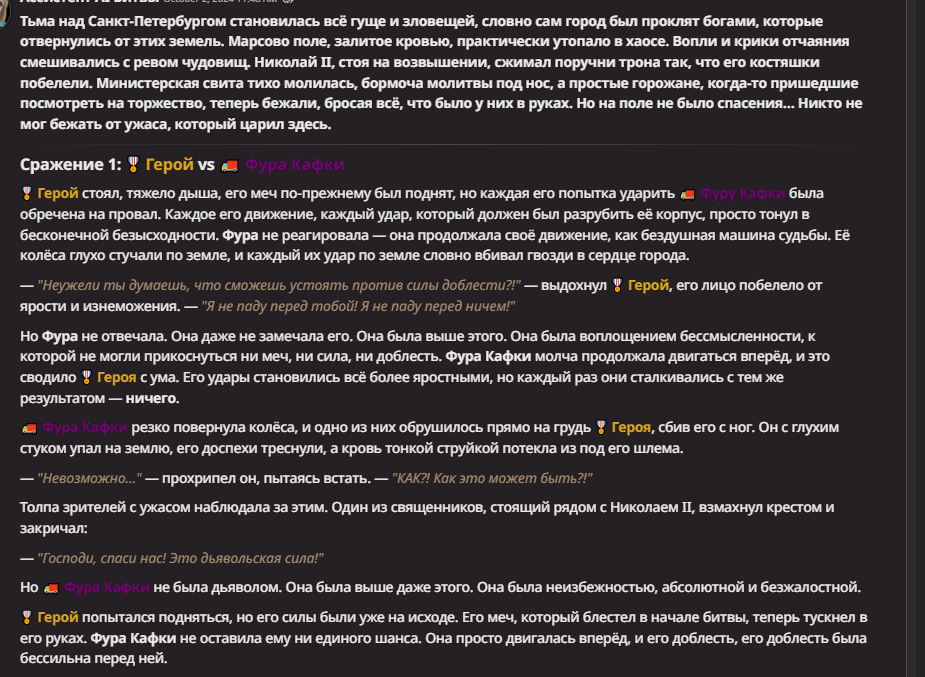 >>1545515 Понятно. Она вообще потекла и напротиворечила себе больше, чем изначально. Потому что в начале она просто выдумала правила "осознание угрозы Рельса убивает", а потом даже запуталась, кто был убит, а кто - нет. В общем, пока еще не доросла до таких финтов. На сей раз я прописал Рельс логически безупречно, но, вот... Значит, пускай полежит до следующей версии Гопоты. Тем более, свой бой он выиграл, пусть и нечестно.