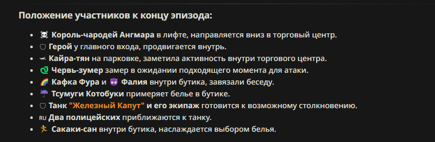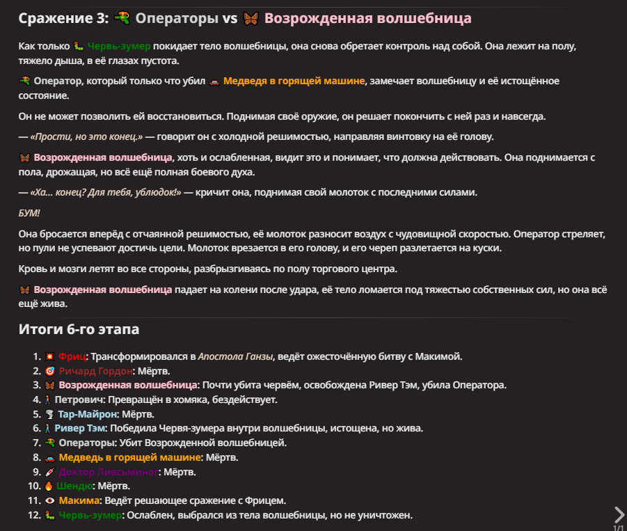 Правила(могут меняться в зависимости от ОПа): 1. Максимум в бою могут участвовать 12 персонажей. После этого набор закрывается и начинается битва. 2.Нельзя предлагать персонажей на около божественном уровне силы. 3.Персонажи с напарниками НЕ запрещены В РАЗУМНЫХ ПРЕДЕЛАХ, с соблюдением баланса сил. Никаких легионов космодесанта. Upd. Уточняйте у текущего ОПа. 4.После участия в бою персонаж уходит на перерыв в 3 боя(сделано для защиты от спамеров одного персонажа). 5.Нельзя предлагать персонажей которые могут призывать других существ без каких-либо условий. Пример: Маг который призывает демонов по щелчку пальцев == не допускается. Маг которому нужны трупы или какой-то длительный ритуал с условиями для призыва демона == допускается. 6.После использования локации она выбивается из случайного списка на 9 боёв.(Почему так много? Ради разнообразия.) Более подробное описание боя вы можете прочитать на втором пике. Upd. Формат может меняться в зависимости от ОПа 7.Набор персонажей полностью закрывается после начала боя и открывается только когда он закончится. 8. Ведущий оставляет за собой право не принять вашего персонажа. Будьте корректны - в случае, если такое произошло, вежливо спросите причину и/или дождитесь другого ведущего.