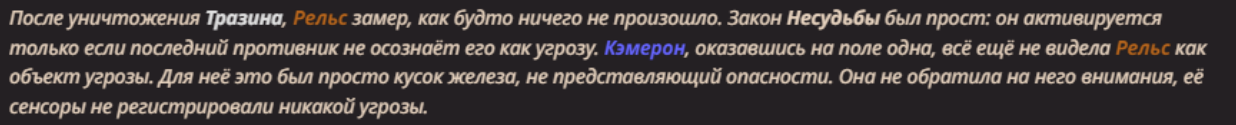 >>1545427 Я бы очень хотел, чтобы его правильно отыграли. Мой прошлый Проклятый Рельс сначала заагрил шамана, который почуял проклятие и самоубился (лол). Поэтому Рельс дожил до финала, но проклятие не вызывало смерть, а сработало по другому, и Рельс стал ебать ткань мирозданья. В этот раз я решил избавиться от "проклятия" и добавить невозможность обретения новых свойств, а смерть финалиста сделать условием игры - не воздействием самого Рельса. Посмотрим.