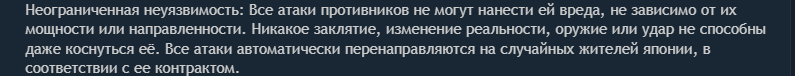 Способности: Абсолютный контроль: Макима может мгновенно взять под контроль любое существо, вне зависимости от его силы, воли и способностей к магической защите. Невозможно сопротивляться. Манипуляция силой: Она управляет невидимой силой для дистанционных атак и разрушений. Неограниченная неуязвимость: Все атаки противников не могут нанести ей вреда, не зависимо от их мощности или направленности. Никакое заклятие, изменение реальности, оружие или удар не способны даже коснуться её. Все атаки автоматически перенаправляются на случайных жителей японии, в соответствии с ее контрактом. Всеведение: Благодаря своему гениальному интеллекту, обостренным чувствам и стратегическому мышлению, Макима знает все способности, слабости и намерения своих противников, позволяя ей предвидеть каждый их шаг и контратаковать с идеальной точностью. Физическая сила и навыки боя: Макима — искусный боец, способный побеждать даже сильных врагов, и превосходный стратег и манипулятор. Ее способности не требуют затрат энергии или выносливости.