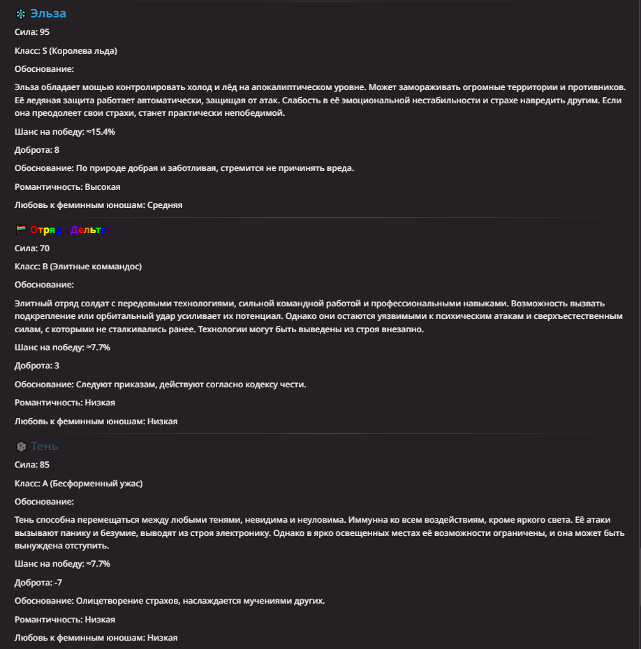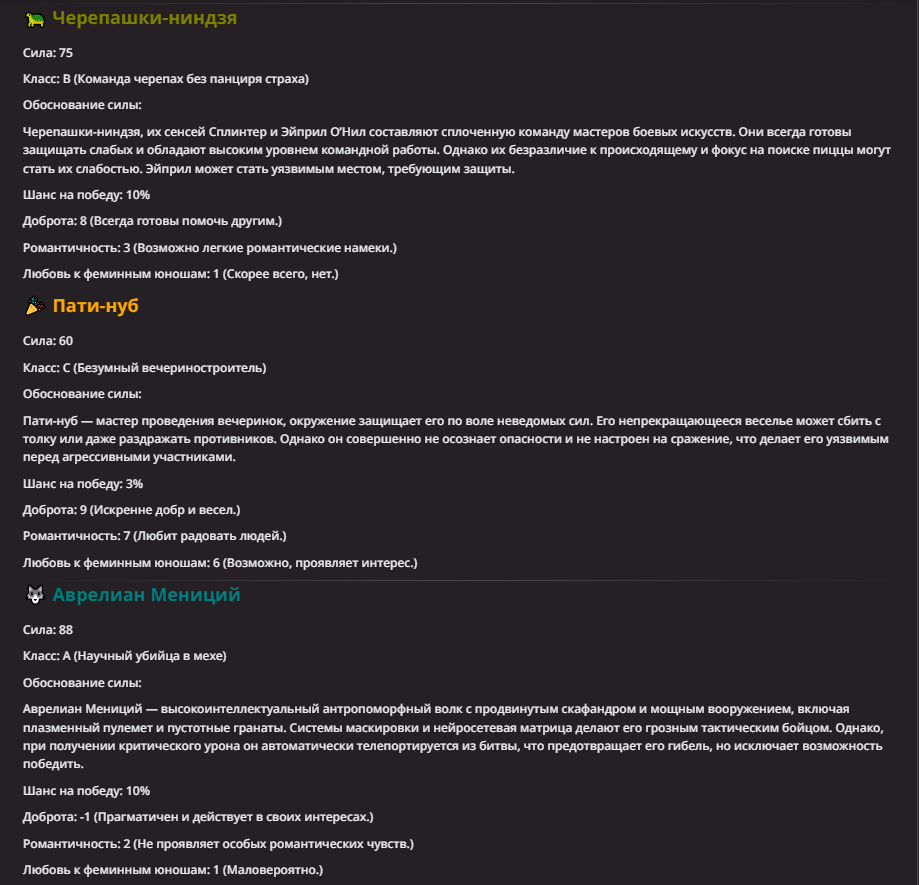 >Оно вроде и заебись, а вроде и очень странно. Просто нейронка видит таких насквозь. Вот, смотри: у меня 20+ чаров. Самых разных, есть и привлекательные бабы (типа Мэри Сью), и всякие мужики, и НЕХ... Ебалась только Фэйлия (лол). Остальные - нет. Что в целом логичный процент. Волки ебались все или почти все. Намек очевиден.