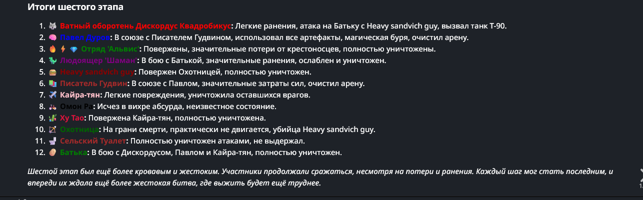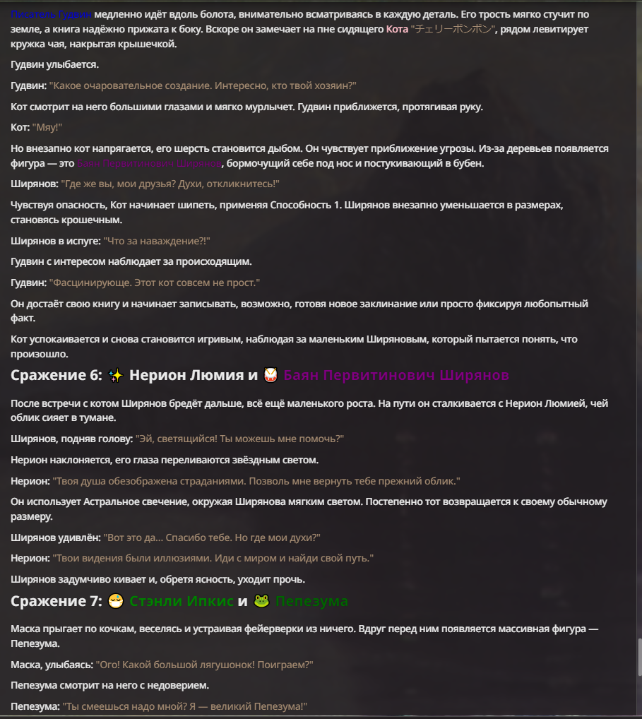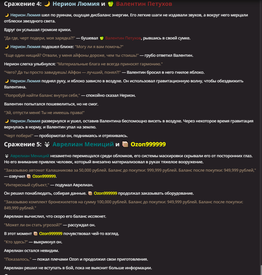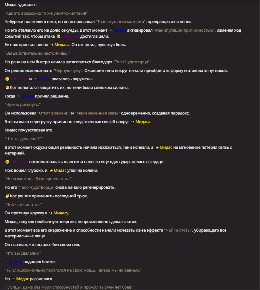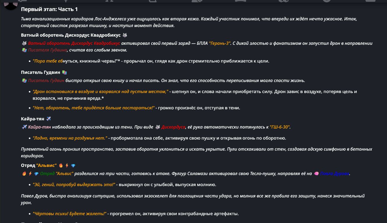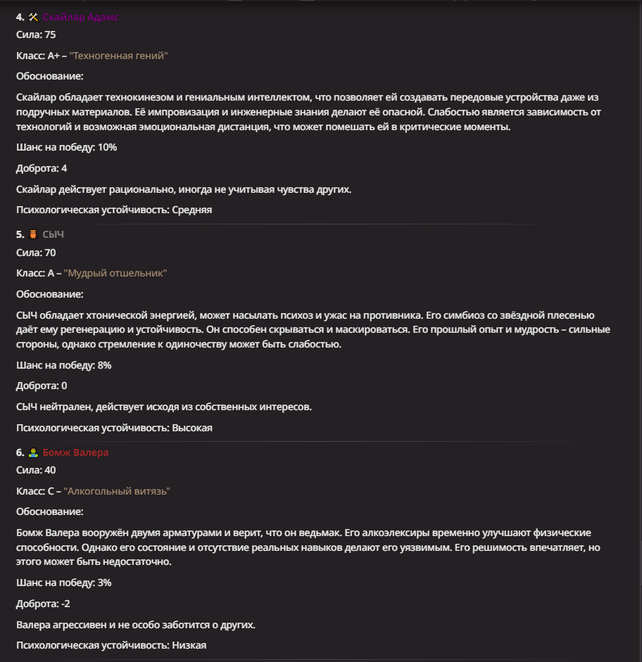 Нео из ГПТ Этот ничем не примечательный парень понимает что он и другие участники и абсолютно все остальное пространство на самом деле не более чем текст, написанные нейросетью. Он не может умереть или ожить, пока нейросеть будет продолжать писать, он не может получать урон, так как понимает тчо это не более чем текст, да и сам он ничего не сможет сделать за исключением того чтобы попытаться убедить других участников, что все происходящее не более чем иллюзия.