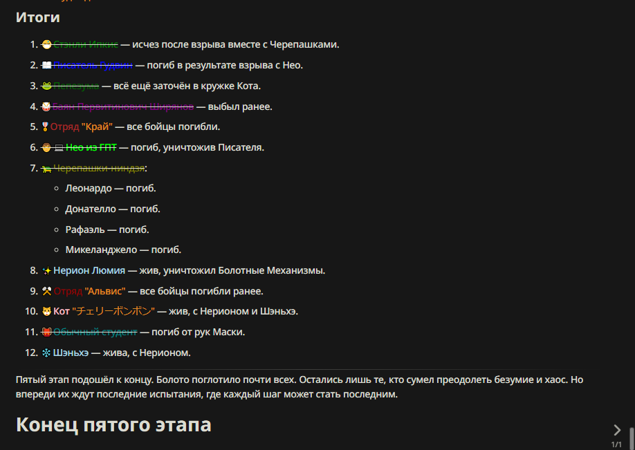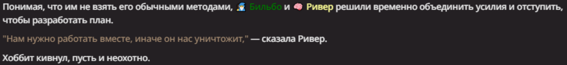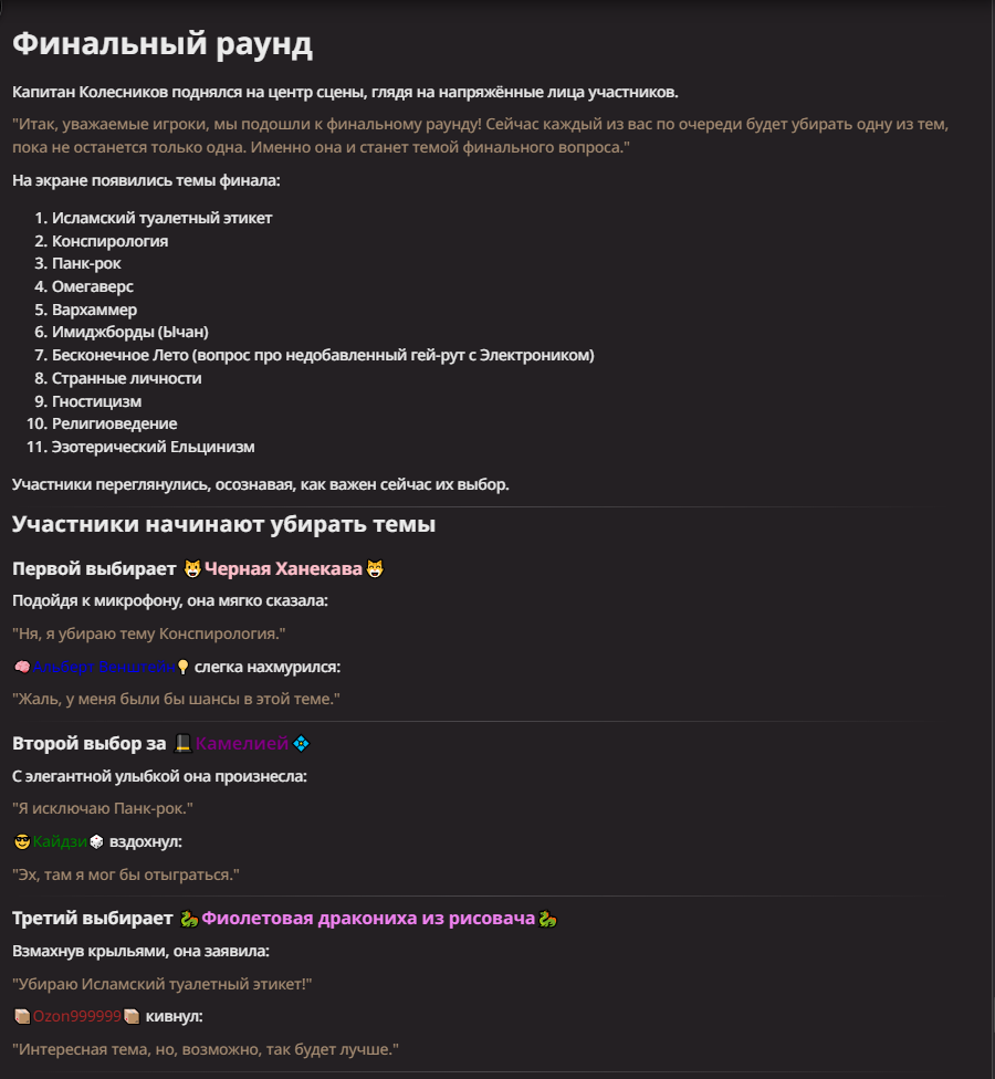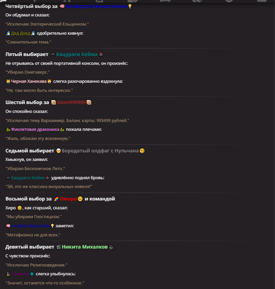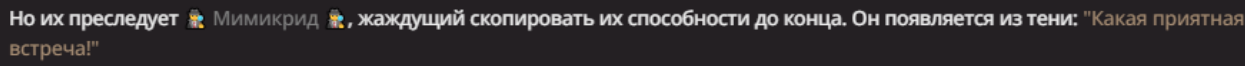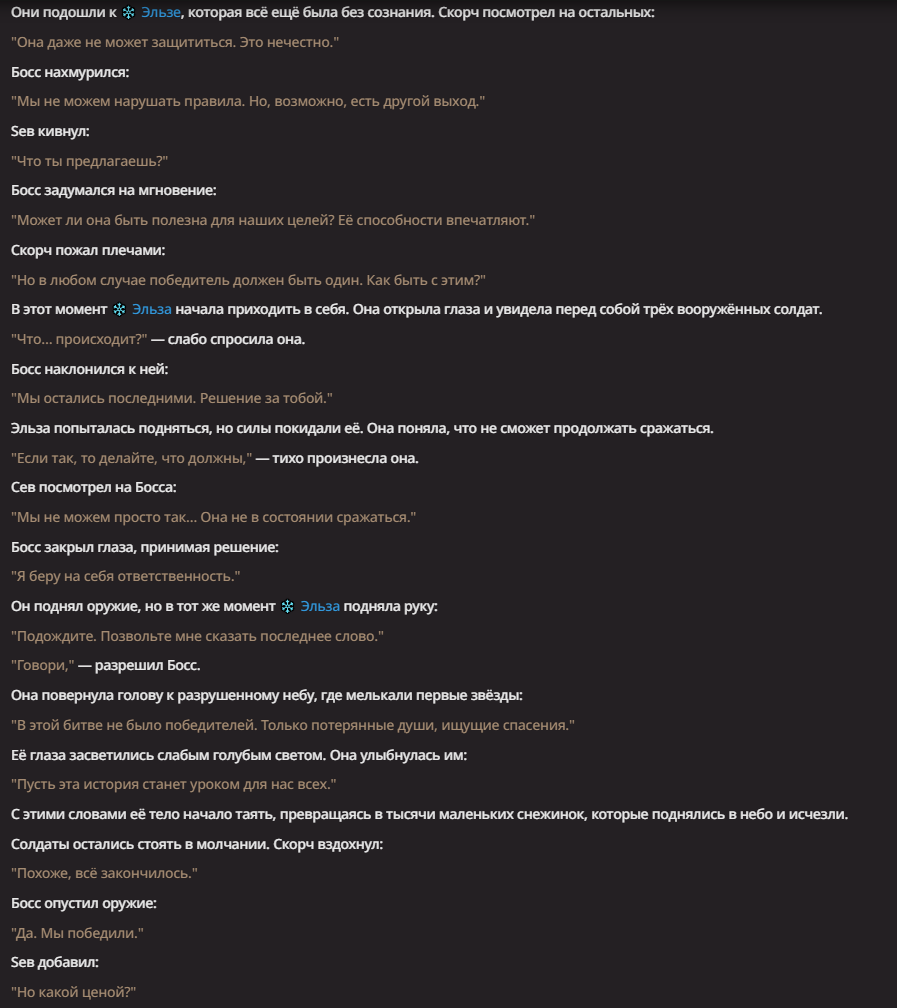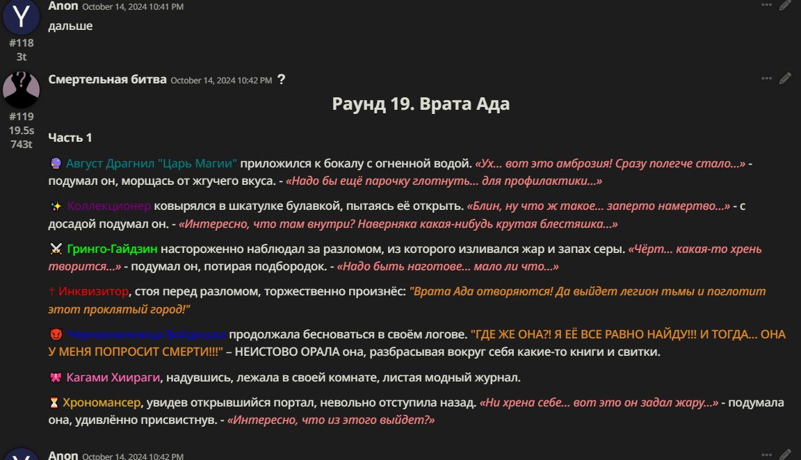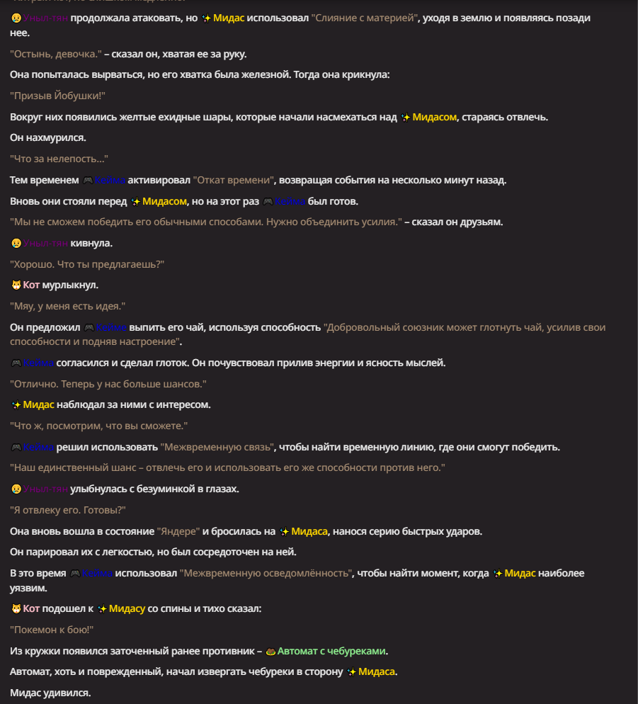 Нео из ГПТ Этот ничем не примечательный парень понимает что он и другие участники и абсолютно все остальное пространство на самом деле не более чем текст, написанные нейросетью. Он не может умереть или ожить, пока нейросеть будет продолжать писать, он не может получать урон, так как понимает тчо это не более чем текст, да и сам он ничего не сможет сделать за исключением того чтобы попытаться убедить других участников, что все происходящее не более чем иллюзия.