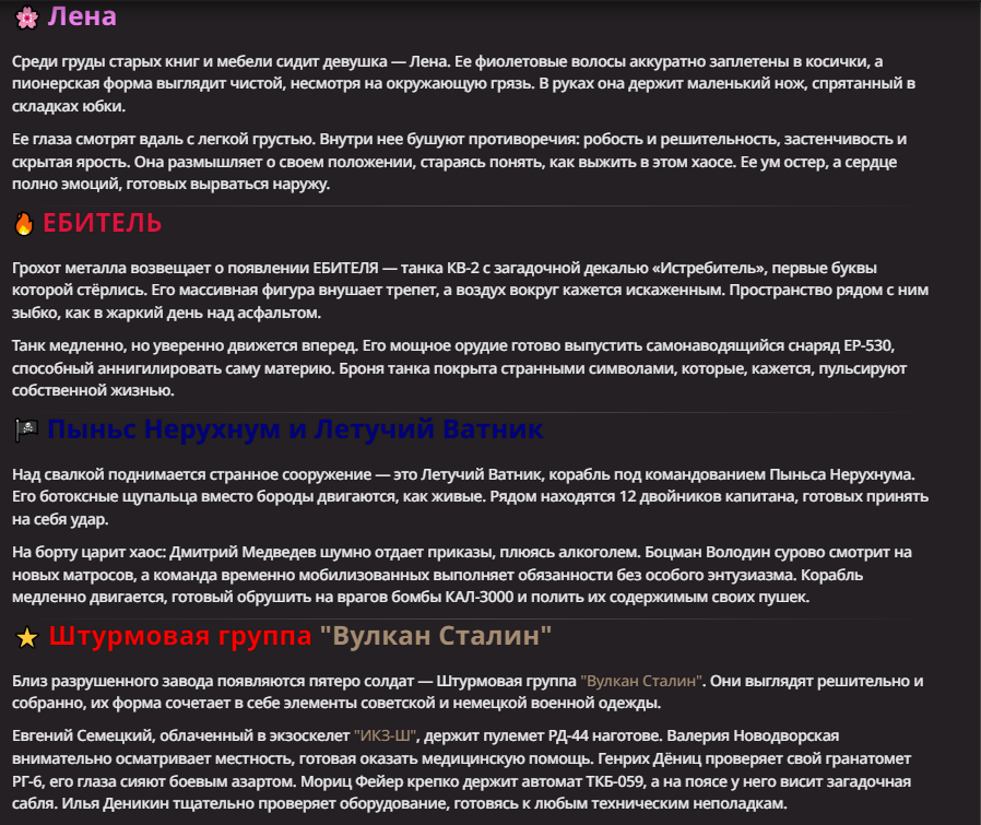 Похоже нейронка ещё в описании поменяла бойца из таркова на Единорога и Хайзенберга. Первого я увидел, а второго только сейчас, и ругался из-за него на нейроночку...