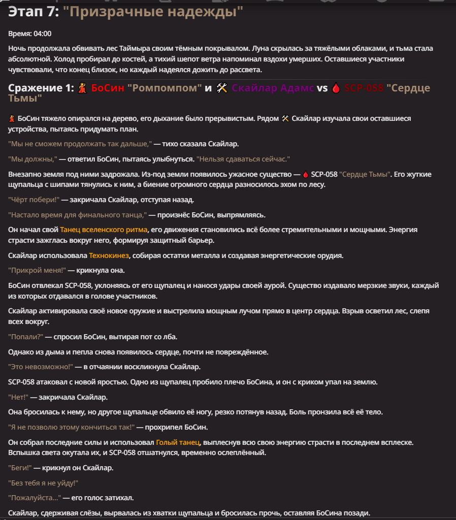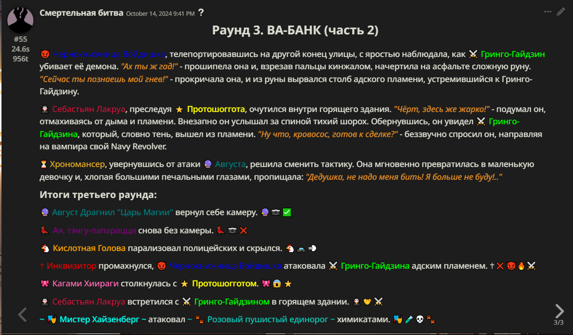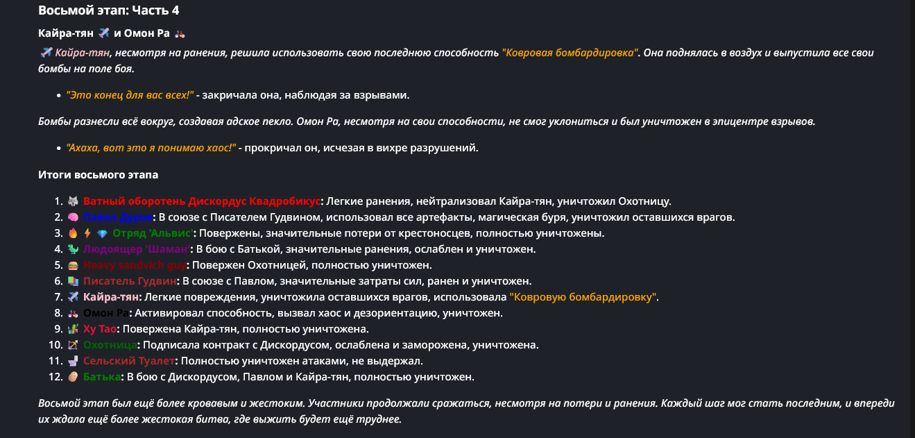 Правила(могут меняться в зависимости от ОПа): 1. Максимум в бою могут участвовать 12 персонажей. После этого набор закрывается и начинается битва. 2.Нельзя предлагать персонажей на около божественном уровне силы. 3.Персонажи с напарниками НЕ запрещены В РАЗУМНЫХ ПРЕДЕЛАХ, с соблюдением баланса сил. Никаких легионов космодесанта. Upd. Уточняйте у текущего ОПа. 4.После участия в бою персонаж уходит на перерыв в 3 боя(сделано для защиты от спамеров одного персонажа). 5.Нельзя предлагать персонажей которые могут призывать других существ без каких-либо условий. Пример: Маг который призывает демонов по щелчку пальцев == не допускается. Маг которому нужны трупы или какой-то длительный ритуал с условиями для призыва демона == допускается. 6.После использования локации она выбивается из случайного списка на 9 боёв.(Почему так много? Ради разнообразия) Upd. Формат может меняться в зависимости от ОПа 7.Набор персонажей полностью закрывается после начала боя и открывается только когда он закончится. 8. Ведущий оставляет за собой право не принять вашего персонажа. Будьте корректны - в случае, если такое произошло, вежливо спросите причину и/или дождитесь другого ведущего.