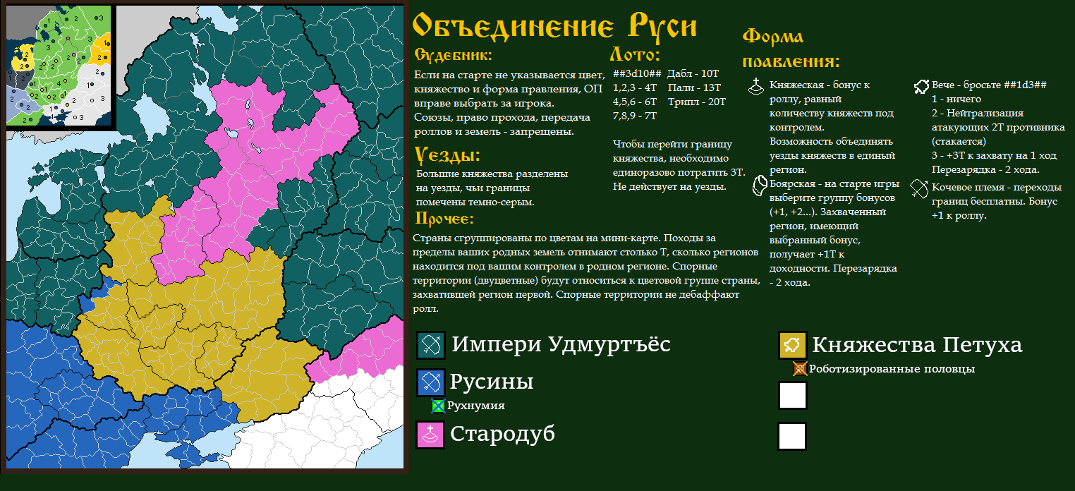 Прочие бонусы: Русины: -2Т к походам. Племенной союз удмуртов: -2Т к походам. Стародуб: -3Т к походам. +3 от княжества, +9 от территорий Княжества Петуха: -5Т к походам.