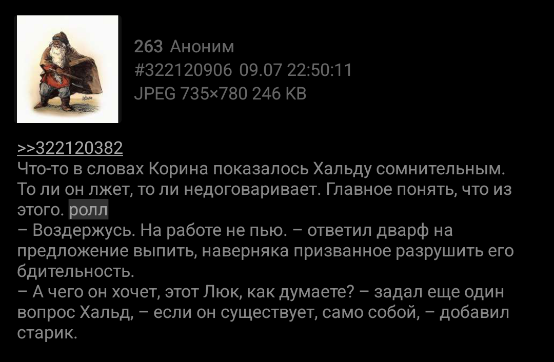 Раньше просто читать было интересно, играть мало кто решался. Напишет анон хороший пост, а его уже забросают похвалами - пиши, мол, еще, годно получается. Так и мог сам с собой проиграть весь тред и никто из других игроков ему не нужен был. Всего 2-3 персонажа на весь тред, зато каких! И читать, и перечитывать тред было сплошное удовольствие.