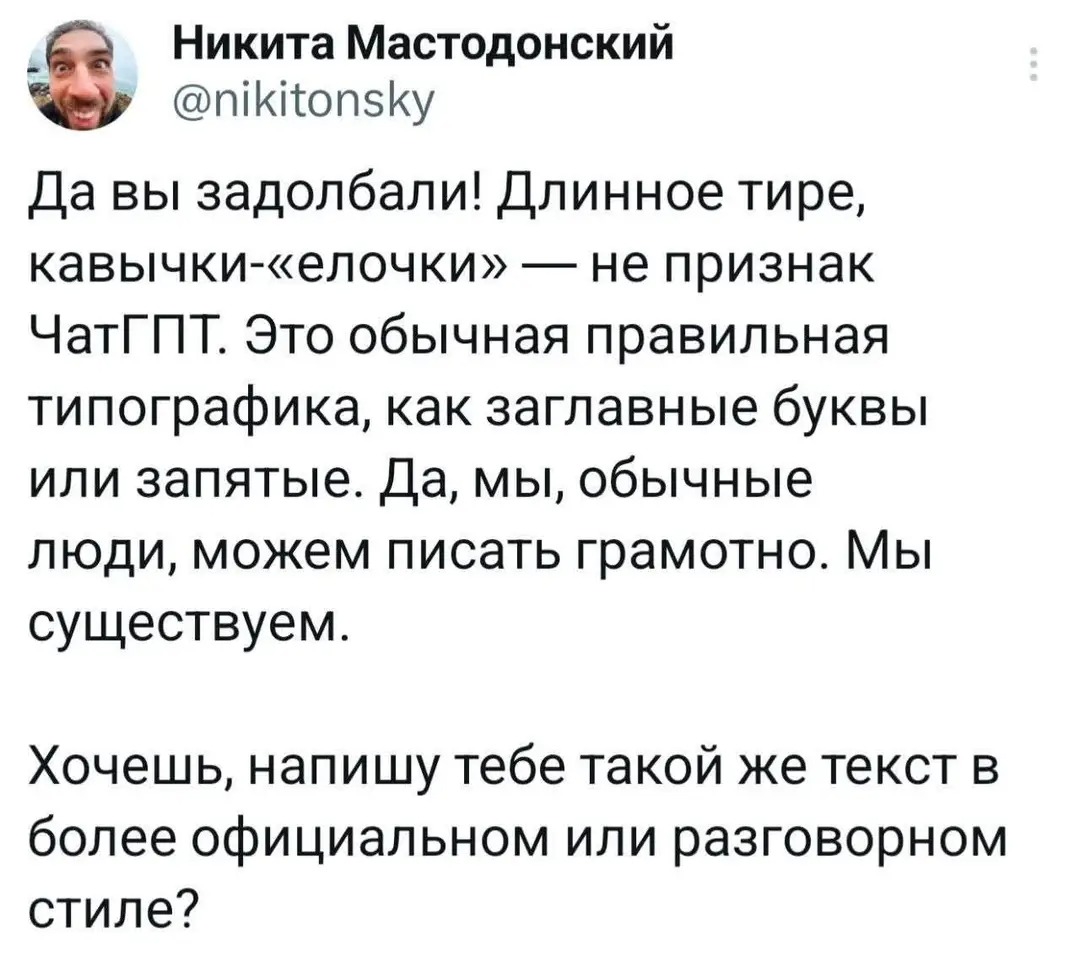 Но стоит мне ответить чуть сложнее, чем «привет, как дела?» — и вот уже кто-то выдаёт: «О, нейросеть подключилась!» или «Видно, что это нейрогенерация». Серьёзно? Если я пишу развёрнуто, с деталями и стилем, это автоматически делает меня алгоритмом?