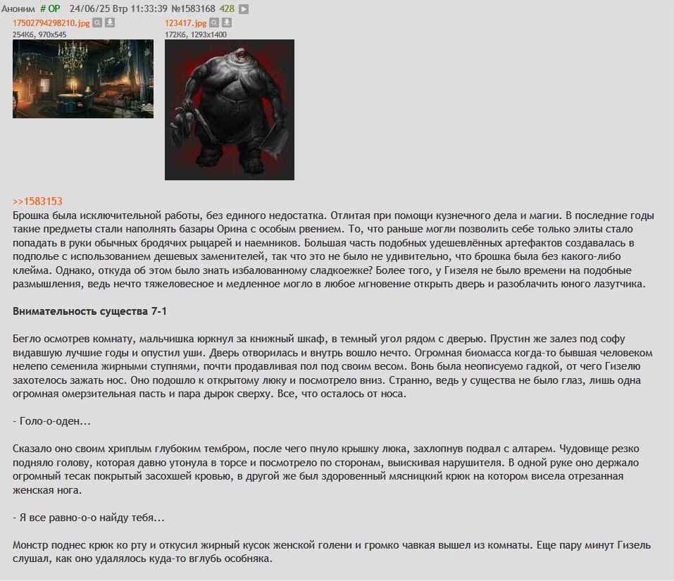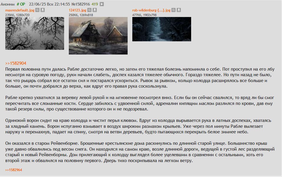 >>1586634 Плюсую. Игры на бордах, форумах, даже на богомерзких диккордных калфах в разы лучше сборов ирл на то чтобы покидать кубики и показывать свое отсутствующее актерское мастерство перед друзьяшками. В лучшем случае это будет фан и лулзы, внутренние мемы, в худшем случае это кринжевая хуета с паузами, мычанием и придумыванием хуйни на ходу. Я уже молчу про погружение и атмосферу, которой нет и не добьёшься ну никак. В треде, соответственно, завелся фантазер-хвастунишка, но закономерно обосрался.