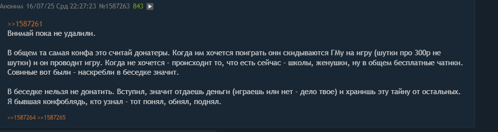 В общем та самая конфа это считай донатеры. Когда им хочется поиграть они скидываются ГМу на игру (шутки про 300р не шутки) и он проводит игру. Когда не хочется - происходит то, что есть сейчас - школы, женушки, ну в общем бесплатные чатики. Совиные вот были - наскребли в беседке значит.