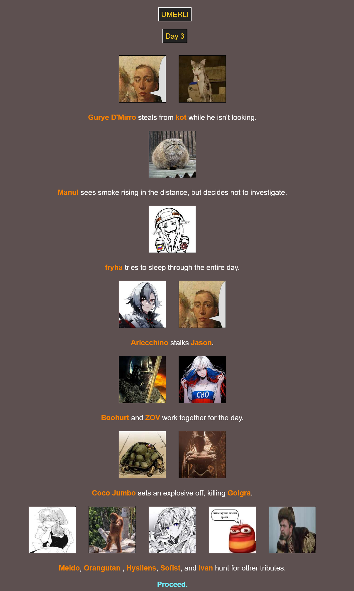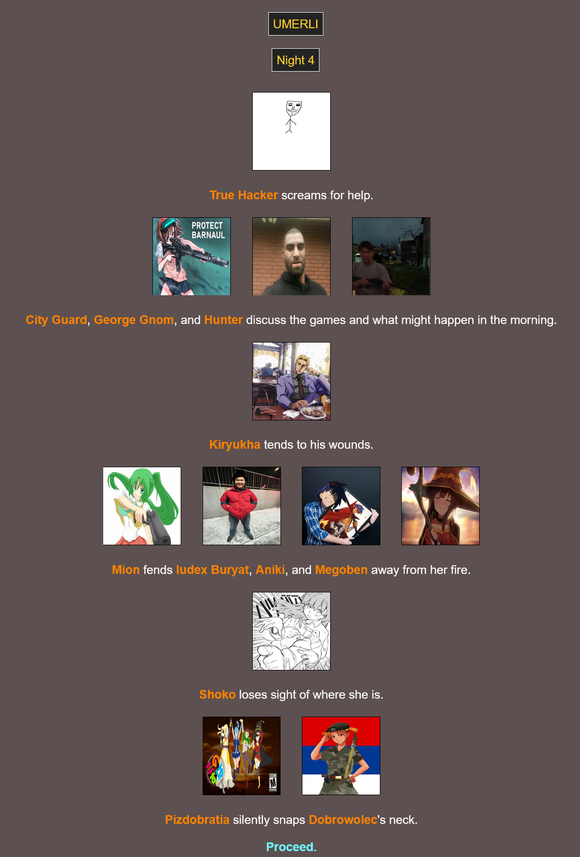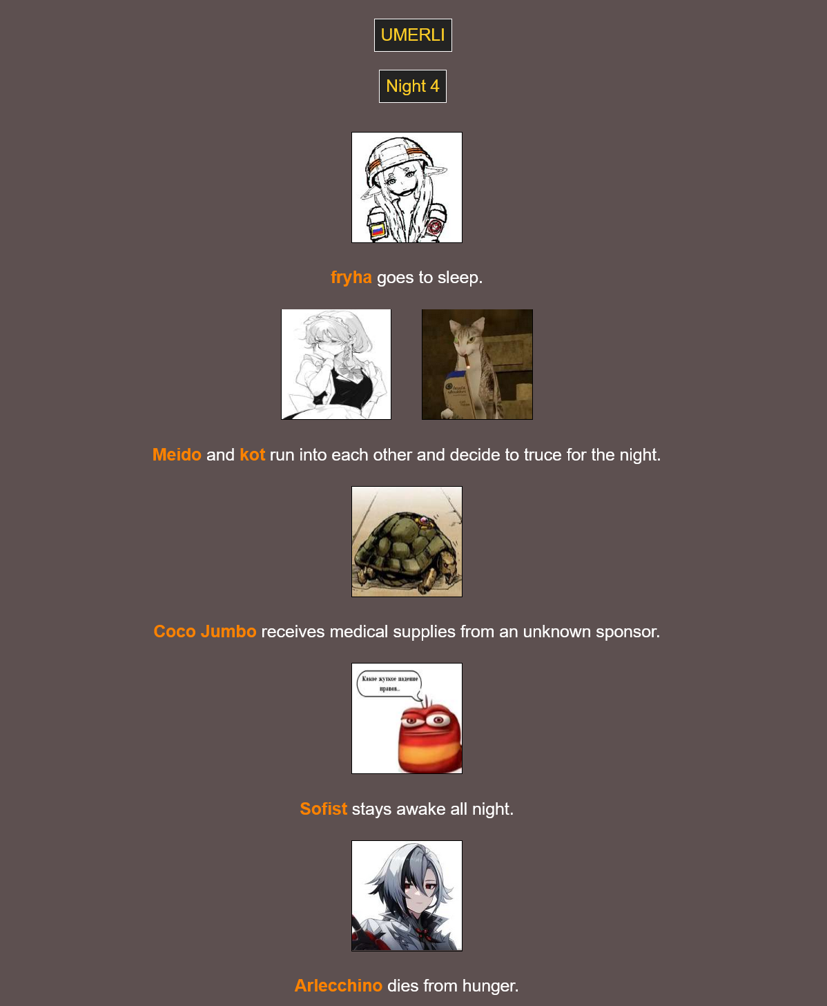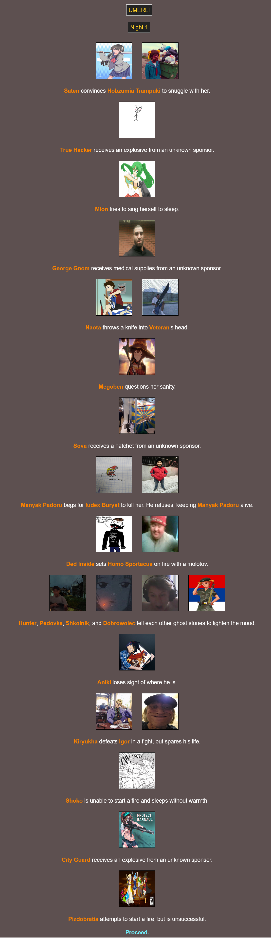 Ничего особого не происходит, кто-то у кого-то ворует, кто-то с кем-то пиздится, всё нормально, разве что Дед Инсайд свалился в яму и помер, Сатэн обронила позвоночник в трусы благодаря Мион, а Наота лишила предводителя ООСД головы.