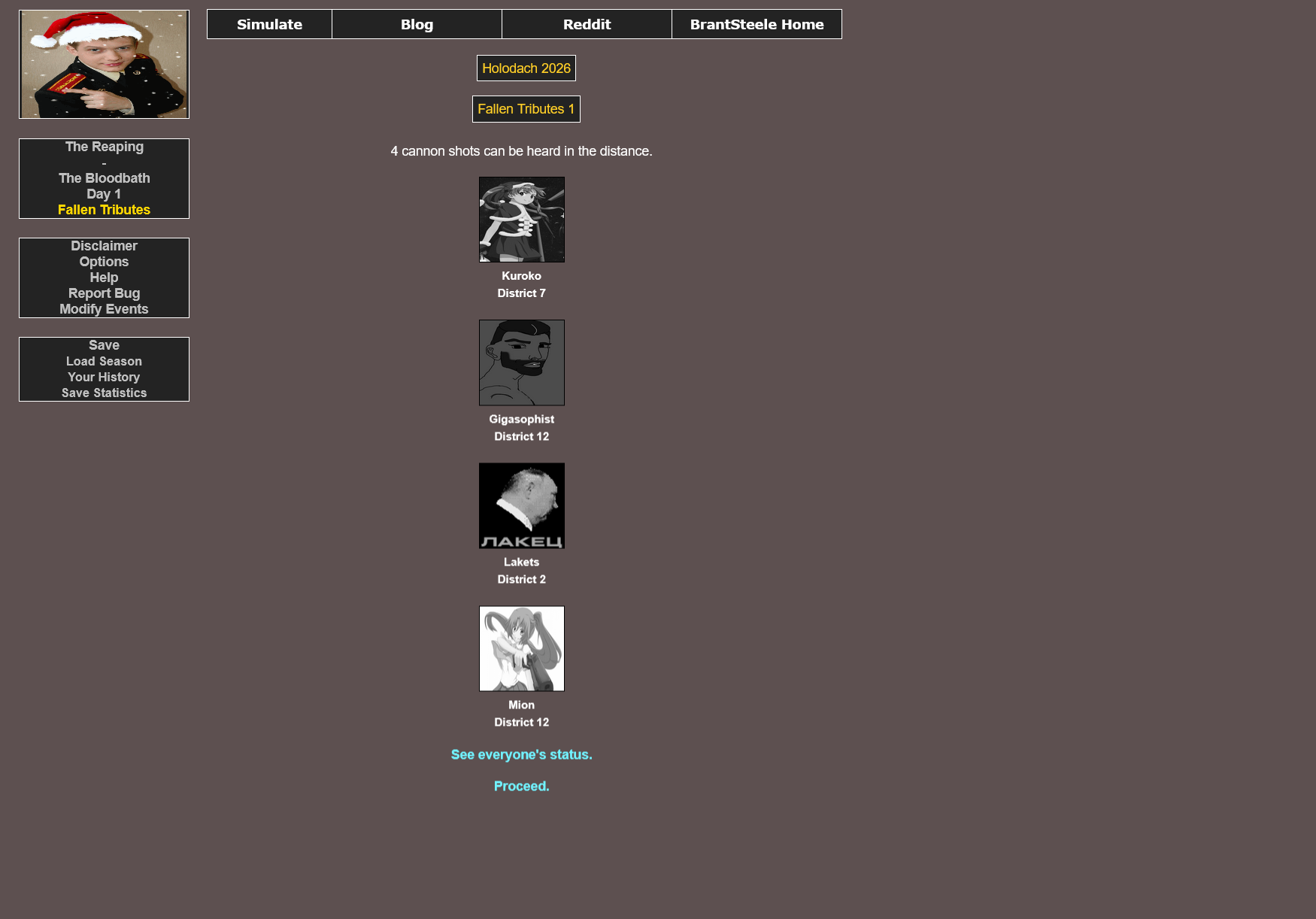 Лолблядь, тут, короче, добавили фигню, что под конец игры персы из одного дистрикта могут начать выёбываться и пригрозить ведущим суицидом, а потому как у нас тут сейчас вообще все 24 такие, то игра как началась, так тут же и кончилась, придётся по-старинке, на 12 дистриктов.