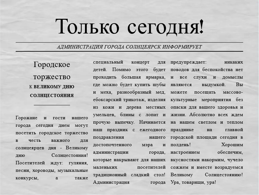 На прилавке действительно лежало несколько свежих ароматных газет, сложенных аккуратной стопкой. На титульном листе была какая-то информация о сегодняшнем праздненстве, до которого оставалось несколько часов и всего четверть часа ходьбы.