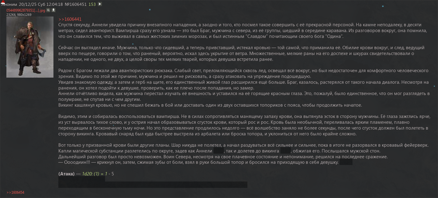 > Обязательность писать длинные посты Тут ты не прав — никто никого ни к чему не обязывает. Просто люди пытаются равняться на окружение. Да, действительно, с большой вероятностью тот, кто на игровой пост в среднем выдаёт по странице А4, косо посмотрит на того, кто пишет три-четыре строки, но это не обязанность, не принуждение. Социальное давление, от которого нужно избавляться. Условный Сталкер-тред вполне нормально игрался с постами мелкими-средними. Примерно таким же был и Стальград. > вникать в сложные правила Ну здесь ты уже явно перегнул.