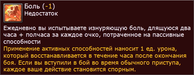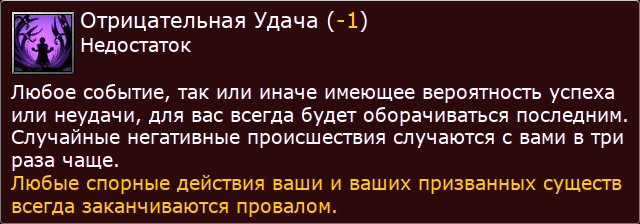 “Отрицательные”: Житель пустыни — Вы совершенно не привыкли к такой погоде. Урон от непогоды наносит вам двойной урон. Слабые руки — В течение жизни вы практически не сражались оружием. -2 к Искусству сражения. Немощность — Ваше тело куда слабее чем у многих. -2 к Стойкости тела. Ненависть к волшебству — Вы терпеть не можете колдовство, колдунов и всё что с этим связано. Вы не способны колдовать, использовать любые магические предметы, которые как-либо связаны с магией, либо понимать магическую суть чего-либо. -5 к защите от заклинаний. Растяпа — Увидев очевидную ловушку, вы просто не в силах пройти мимо. Вы всегда попадаете в ловушки. Изгой — Вы слишком не похожи на окружающих. При одном только взгляде на вас, все наполняются злобой и желают вас прикончить. Все, кроме других игроков будут отказываться коммуницировать с вашим персонажем, и будут настроены на грани враждебности. Живой магнит — Врождённая способность приманивать к себе тех, кто хотел бы полакомиться вашей тёплой плотью. Слабое сердце — При достижении здоровья в 1, вы умираете сразу. Спастись трейтом, роллом, удачей, или магией не выйдет. Это конец. Скудоумие — Думать, размышлять и делать планы наперёд, не является вашей сильной чертой. -2 Интеллекта. Житель провинции — Вы не привыкли находиться в суровых, зимних условиях. -2 к Выживанию. Несвертываемая кровь — При получении ранения, если в течение скорого времени не будет использовано лечащее средство, вы теряете дополнительно 1ХП. Невезучий — Для достижения успеха вам нужно на одну грань кубика больше. Короткие ноги — Вы передвигаетесь очень медленно. Вы не способны догнать убегающих или убежать от преследования. Невозможно носить броню. Сделка с Лилит — Богиня страданий желает зрелищ. На выбор она предлагает вам три контракта. При выборе более высокой степени, все бонусы с младших сохраняются. Вкус крови (I) (Вы получаете 3 очка характеристик). Отчаянье (II) (Предоставляется 1 бесплатный трейт вне лимита). Погибель (III) (+1 ко всем характеристикам вне лимита). Но помните, чем могущественнее контракт, тем больше ваше путешествие будет наполнено ужасами и болью. Тяжёлое вступление — При старте вы бросаете кубик. Чем ниже результат, тем хуже для вас. (Шанс на — Получение ранений, временных дебаффов, потерю одноразовых предметов). Неуклюжий — Вы не можете прятаться или оставаться незамеченным. Метка Тсари — За вами по пятам идёт смертоносный охотник за головами, у него всего одна цель, выследить вас и убить. Рок судьбы — Один раз за игру, в самый неподходящий и опасный момент вашего приключения, ваш бросок кубика станет 1. Пацифист — При убийстве любого живого существа, вы впадаете в депрессию и теряете 1ХП. Привереда — Приготовленная или добытая в диких условиях еда, не восстанавливает вам ХП, а только утоляет голод. В розыске — Невозможно попасть и находиться в поселении авантюристов (Альтернативная ветка на успешное окончание приключения). Оккультист — Ваша душа искажена следом дьявола. Вам нужно проводить кровавые обряды. В случае игнорирования позывов, Сульфир будет поглощать вашу душу.