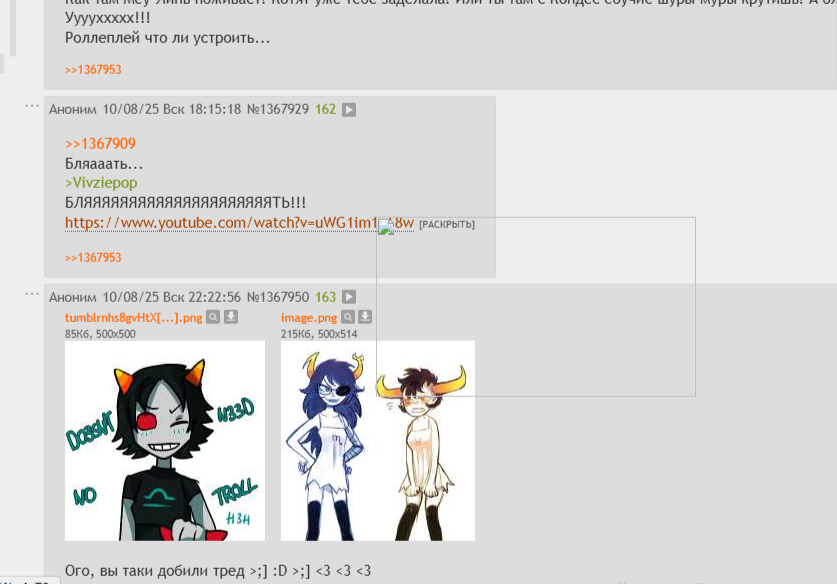 Ого, вы таки добили тред >;] :D >;] <3 <3 <3 Я бы, ну знаете, обсудил комикс, да вот только не читал ХС2. Там есть собачий хуец Джейд? Может посрём в треде и початимся как в старые? Охуенные судари чатодружесы, лол. Чё там в моде? Ваха, Твин Пикс, Стивен Юниверс... И вообще реквестирую видео с DOMIQE от Пеги.