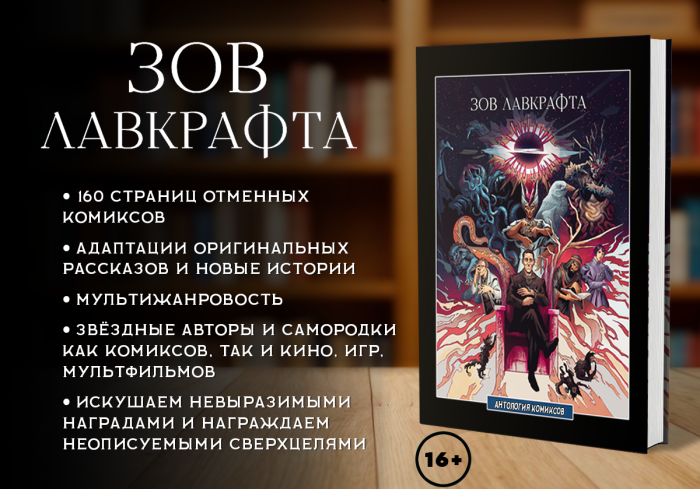 СОСТАВ И АВТОРЫ СБОРНИКА: ЗОВ - комиксация по мотивам рассказов "Ньярлатхотеп" и "Зов Ктулху". Художник - Иван Ешуков. Сценарист - Айк Варданян. "Зов" это комикс-предисловие к циклу "Зов Н.Ё.Х.", предваряющий "Сталинградский рубеж". Да и в целом это о том что предсказания Лавкрафта сбылись и Древние наконец проснулись ввергнув мир в настоящий хаос (но непокорные смертные всё же надеются дать отпор кайдзю Древним). ГОРОД - комиксация "Хребтов безумия", от Аскольда Акишина. СТАЛИНГРАДСКИЙ РУБЕЖ - первая глава комикс-цикла "Зов Н.Ё.Х.", историй в жанре меха-кайдзю с лавкрафтовским уклоном. Художник - Борис Дарт, сценарист - Айк Варданян, арт-директор - Александр Крылов. КОШКИ УЛТАРА - адаптация одноимённого рассказа, художник и сценарист Елизавета Воронина. Елизавета преподаватель комиксов в одной из известнейших Digital-школ России. ЧАЕПИТИЕ У ГОВАРДА - оригинальный комикс звезды мировой манги Олеси Нао, сценаристов Ивана Простецкого и Виталия Савенкова. МУЗЫКА ЭРИХА ЦАННА - комиксация одноимённого рассказа, художница Banish Nightmares, сценарист Айк Варданян. Музыкально-графический эксперимент для настоящих гурманов любящих картинки со звуками. КАРИЕ ГЛАЗА БЕЗДНЫ - пролог оригинального комикс-детектива Романа и Ксении Павловых. ДЕТЕКТИВНОЕ АГЕНТСТВО "АНАНСИ" - еще один детективный комикс по-лавкрафтовски. Автор - Андрей Новащук, художник - Александр Дьяков. ЖЕРТВОПРИНОШЕНИЕ - комикс про жриц Итакуа от Екатерины Захаровой. ИНЫЕ БОГИ - адаптация одноимённого рассказа, сценарист и художник - Семён Фелонюк. ГРИМУАР ТЬМЫ - авторский комикс от Devilhs. АБСОЛЮТНО ЧЁРНОЕ ТЕЛО - постапокалиптическая история по-лавкрафтовски. Художник - Nekota, мастер над фандомами и матер-татуировщик. Сценаристы - Павел Усачёв и Айк Варданян (Усачёв обычно пишет топовые киносценарии и ведёт блог о кино, это его дебют в комиксах). НЕВЕСТА ГЛУБИН - оригинальный комикс Елены Скиталец, мастера остросюжетных комиксов. ПЕРЕЖИВШИЙ ЧЕЛОВЕЧЕСТВО - единственный постапокалиптический рассказ Лавкрафта. Сценарий Айка Варданяна, рисунок - Адама Григоряна.