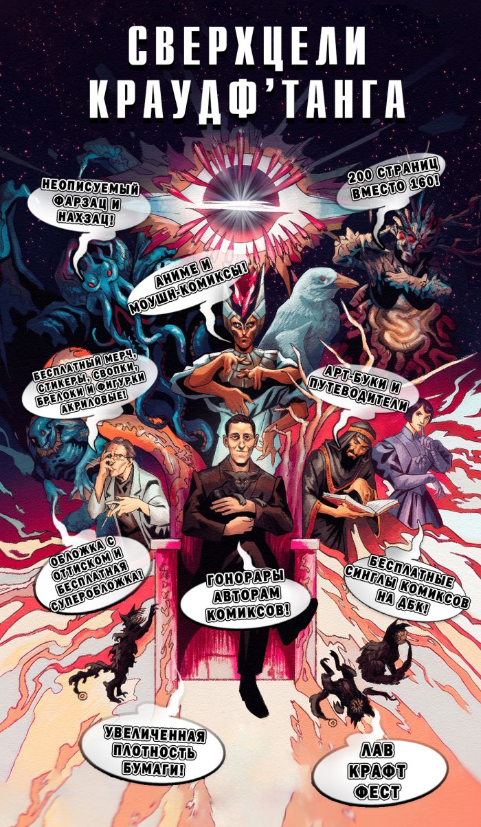 1. Печать сборника запланирована в конце января - начало февраля, те кто заказал несколько месяцев назад получат компенсацию в виде набора мерча из стикеров, своп-карт, небольших постеров. 2. По прежнему открыты к сотрудничеству с авторами комиксов неравнодушными к Лавкрафту. Сценаристам и художникам на заметку - будет еще несколько сборников. 3. Объём первого выпуска варьируется от 160 до 200 страниц. Всё зависит от хода краудф'танговой кампании и набора сверхцелей. 4. Среди сверхцелей - роялти авторам, фарзац и нахзац от Храма, обложка с оттиском, увеличенная плотность бумаги, моушн-комиксы, комиксы на ДБК, комикс-путеводители по мирам Лавкрафта, фестиваль Love+Craft+Robots и даже аниме по одному из комиксов.