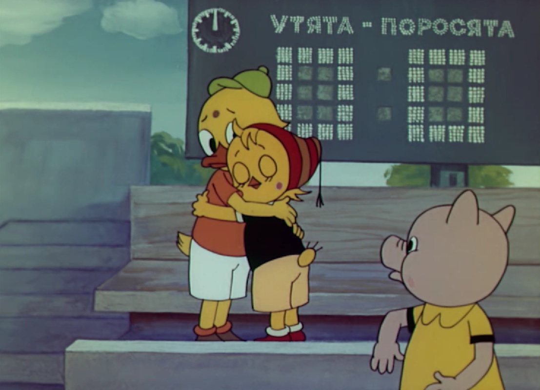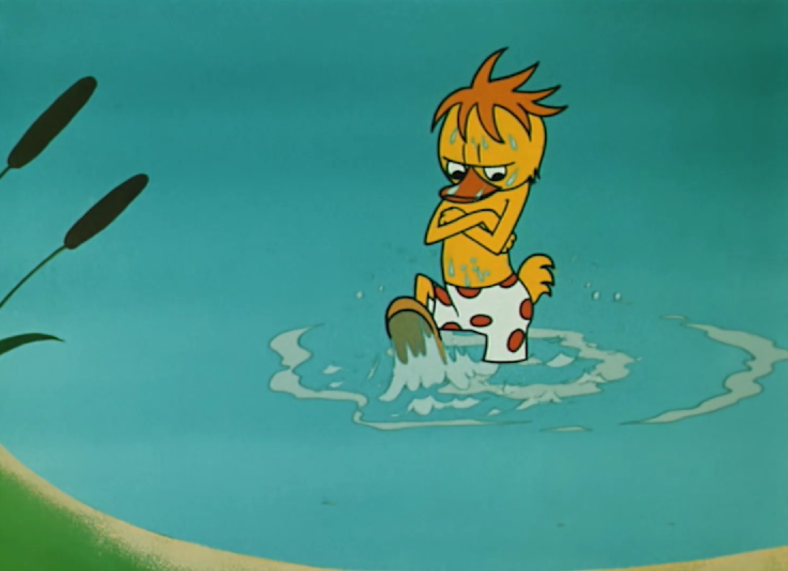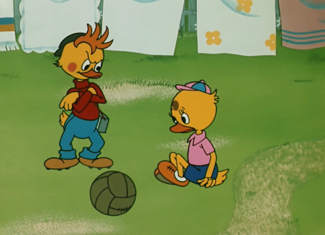 1) Утёнок, который не умел играть в футбол, 1972 год. Утёнок является изгоем в дружном коллективе пернатых пионеров. Ситуацию усугубляет родимое пятно на весь лоб, которое служит поводом для издевок со стороны других утят. Также, как выясняется по ходу сюжета, утёнок не умеет ничего из того, что умеют другие ребята: ни в футбол играть, ни плавать. Он вспоминает слова Конфуция: "Разве благородный муж должен быть умел во многих вещах?", но другие утята пллют на его философию. Птенчик пытается задобрить травителей, делая единственное, что у него хорошо получается - музицируя на трубе. Однако ошибается с выбором репертуара, наигрывая "Ах мой милый Августин" в кругу патриотов ВОВ. Разумеется, за такой фортель получает ещё один клевок. Но вот наступает футбольный матч утята-гусята. Утёнок подбарривает утят игрой и они выигрывают! Разгорячённые победой мальчишеские тела устремляются в раздевалку, не забыв прихватить с собой нового друга... Конец. Утёнок нашёл своё место в жизни.