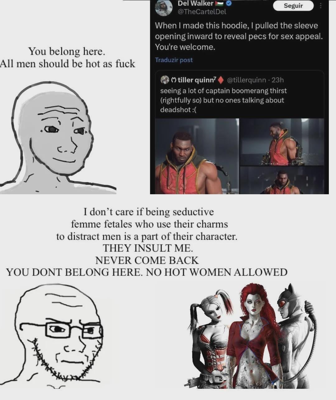 То же самое относится к лицемерной позиции адептов теории о "мужском взгляде", когда любое изображение женских персонажей красивыми/сексуальными в масскульте порицается воукнутыми как сексизм и объективизация. В то же время изображение мужских персонажей красивыми/сексуальными не только ими не порицается, но и наоборот всячески восхваляется. Большинство людей сыты по горло подобным двоемыслием, и именно поэтому не желают поддерживать воук-проекты кошельком.