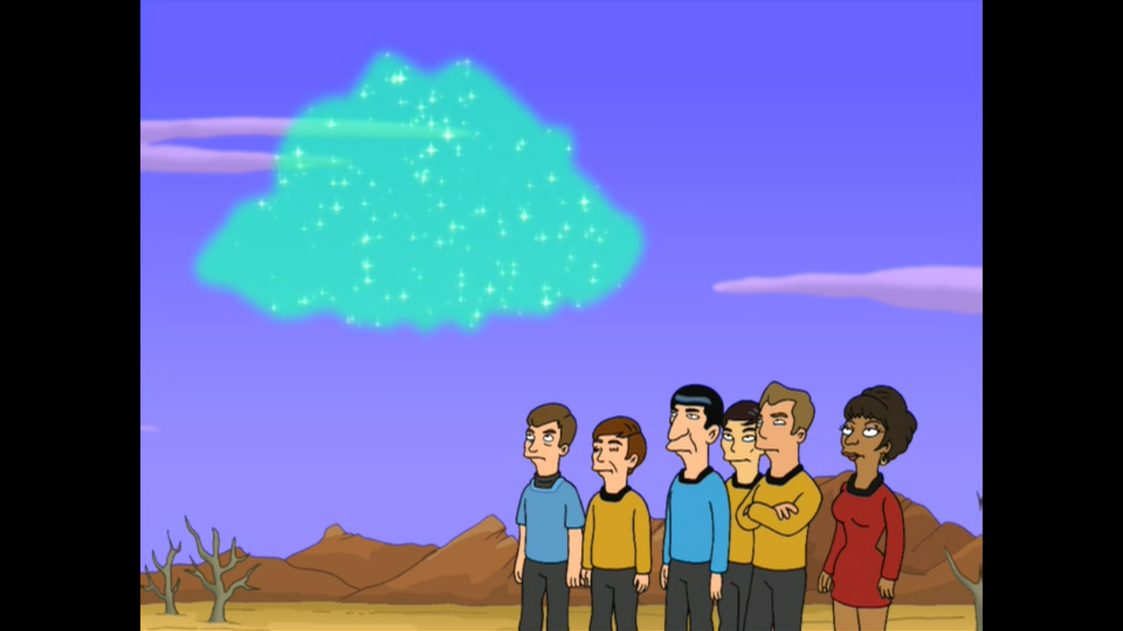 Было довольно оригинально и неожиданно, когда антагонист (это инопланетное разумное облако, фанатеющее по Стар Треку) между делом сказало, что оно именно злодей, пленивший актеров, а Фрай, Лила и Бендер — герои, пытавшие спасти актеров, рискуя своими жизнями.