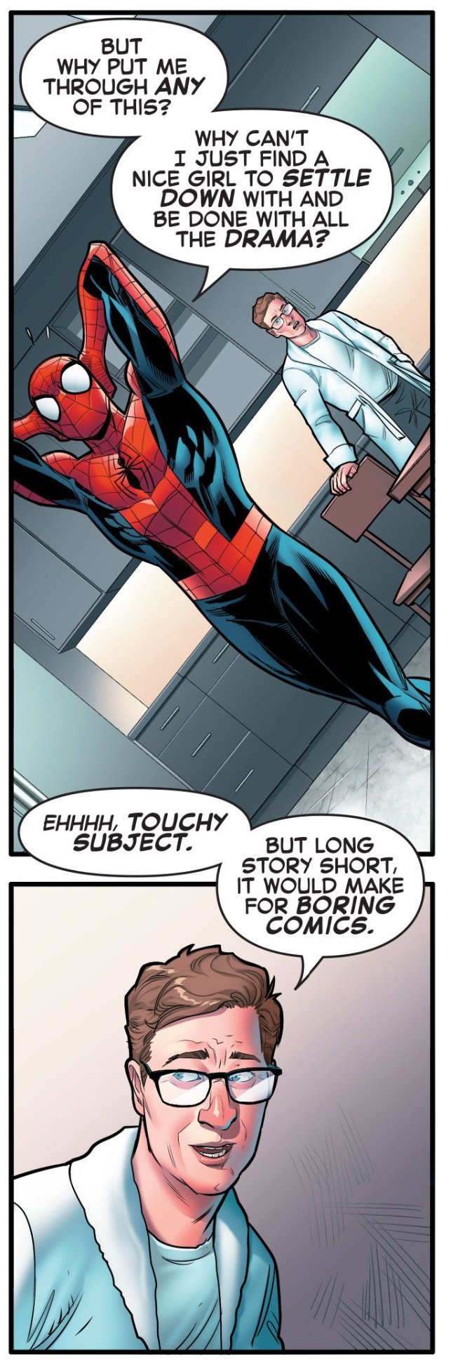 >>1357985 Это вроде некакнон или действие разворачивается раньше. Питер, вроде, будет с Мэри Джейн, а не всратым лавинтерестом от Уэллса, к примеру.