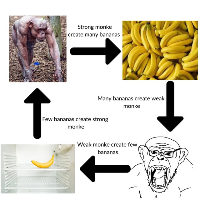 Ну, как бы - "что посеешь, то и пожнёшь", культура отмены, ущемления по любому поводу, неповорачивающаяся стрелочка, всё вот это. Глобалисты пережали палку с построением "прекрасного нового мира" и теперь она даёт им по лбу, нихуя нового. Всё равно в перспективе консерваторы проиграют, ведь - а давайте, всё оставим как есть, при явном системном кризисе и отчетливо проступающем переходе в новый технологический уклад, проигрышная позиция. И попытки вернуться на экстенсивный путь путём заселения Маркса по Маску выглядят маловероятно, в отличии от неофеодализма с регулированием потреления через цифровые валюты.