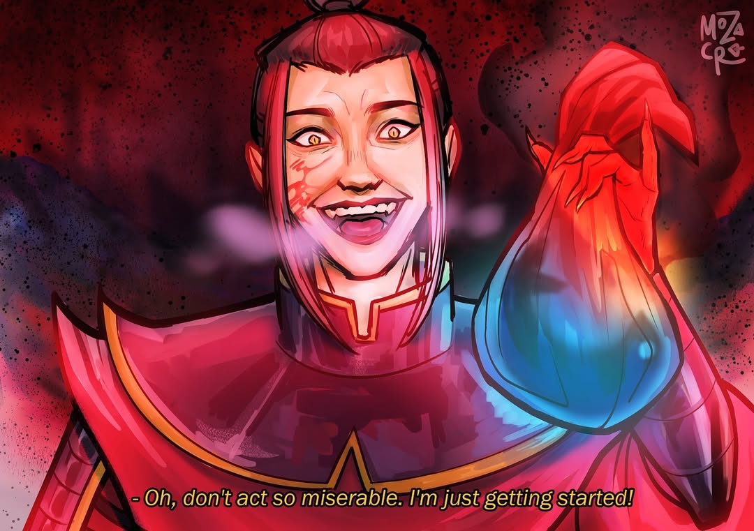 Почему Азула могла кастовать молнию поехав кукухой? Первый вариант: уже упомянутый опыт, может техника и опасная, но она её оттачивала до совершенства, буквально тренируясь пока ни один волос не шелохнется. Вариант второй: техника опасная, но не очень, достаточно чтобы заботливый дядя отказался ей учить, но недостаточно чтобы за несколько неправильных кастов гарантировано убить себя, к тому же, Азуле скорее всего было все равно на последствия. Вариант третий, душевное равновесие не означает спокойствие. Истеричка Зуко, у которого каждую секунду новая обида и эмоция, не подходит для молний. Азула, которая может контролировать эмоции и ощущает себя превосходно, подходит для молний. Азула, которая полна отчаянья, злобы и обиды ... подходит для молний, так как у неё нет колебаний. Да все эмоции негативные, но она стабильно чувствует себя плохо, а значит случайных искр не будет. Вариант четвертый: Айро либо специально, либо случайно врёт Зуко о природе молнии, либо чтоб его не тренировать, либо потому что просто имеет свою кринжовую духовную интерпретацию процесса, который гораздо проще и приземлённый.