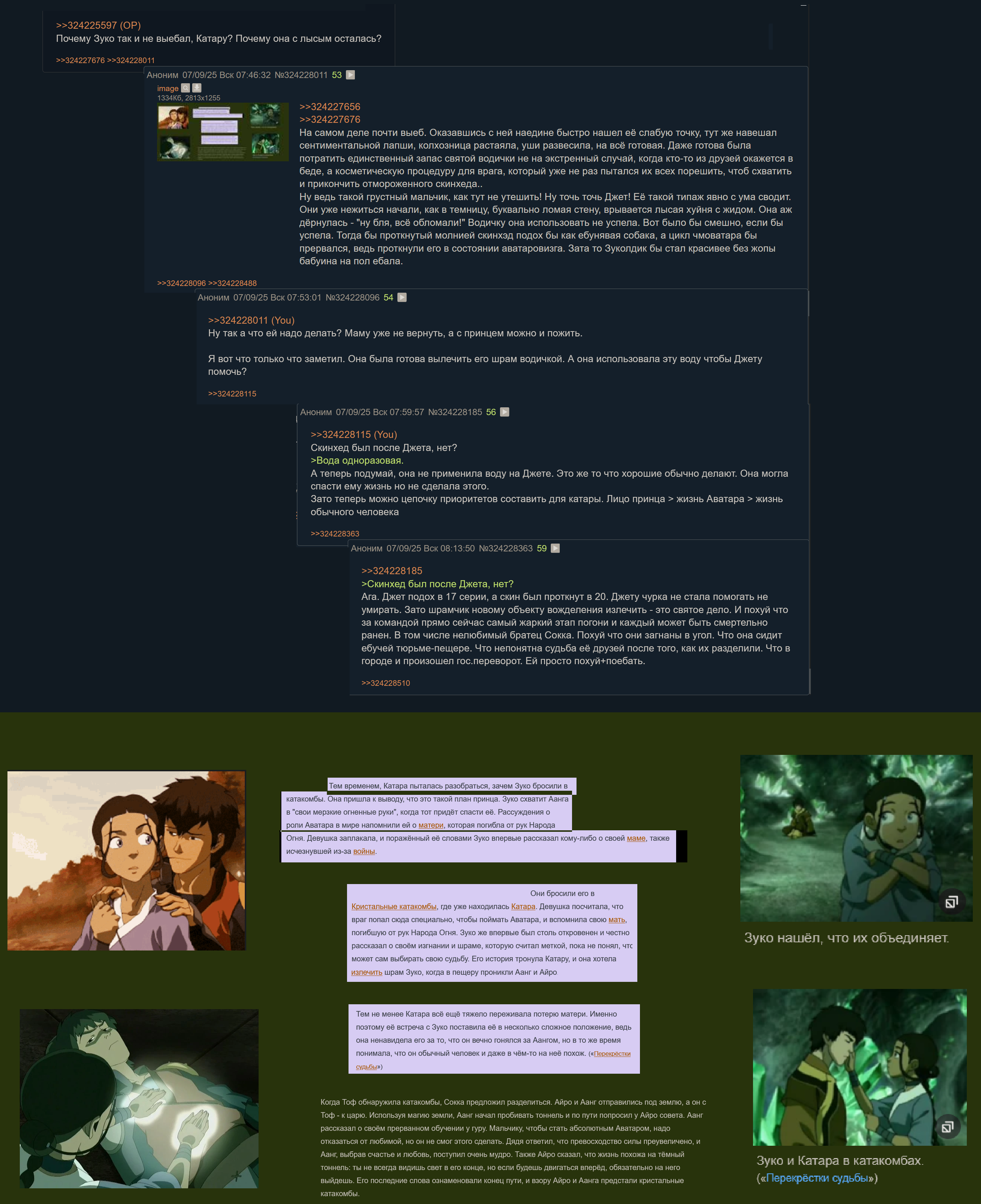>>1372397 >Дальше что? Поставили бы новым Лордом Огня Айро, ибо у Зуко тогда ещё дурная репутация была. Далее пошли бы по привычному сценарию: вывод войск из Царства Земли, решение вопроса колоний и т.д. >>1372398 >Люди до нашей эры умели затмения предсказывать. А к вселенной мультика это как относится? >Ну из всей этой тирады я понял, что Аватару можно делать все Ну а я понял, что для тебя использование записей духа против его воли для прекращения кровопролитной войны равняется какому-нибудь геноциду. >Я думаю Озай дольше смог бы продержаться. Терпел от Зуко с двумя мечами, но надрал бы зад аватару с тремя стихиями? Ты серьёзно?