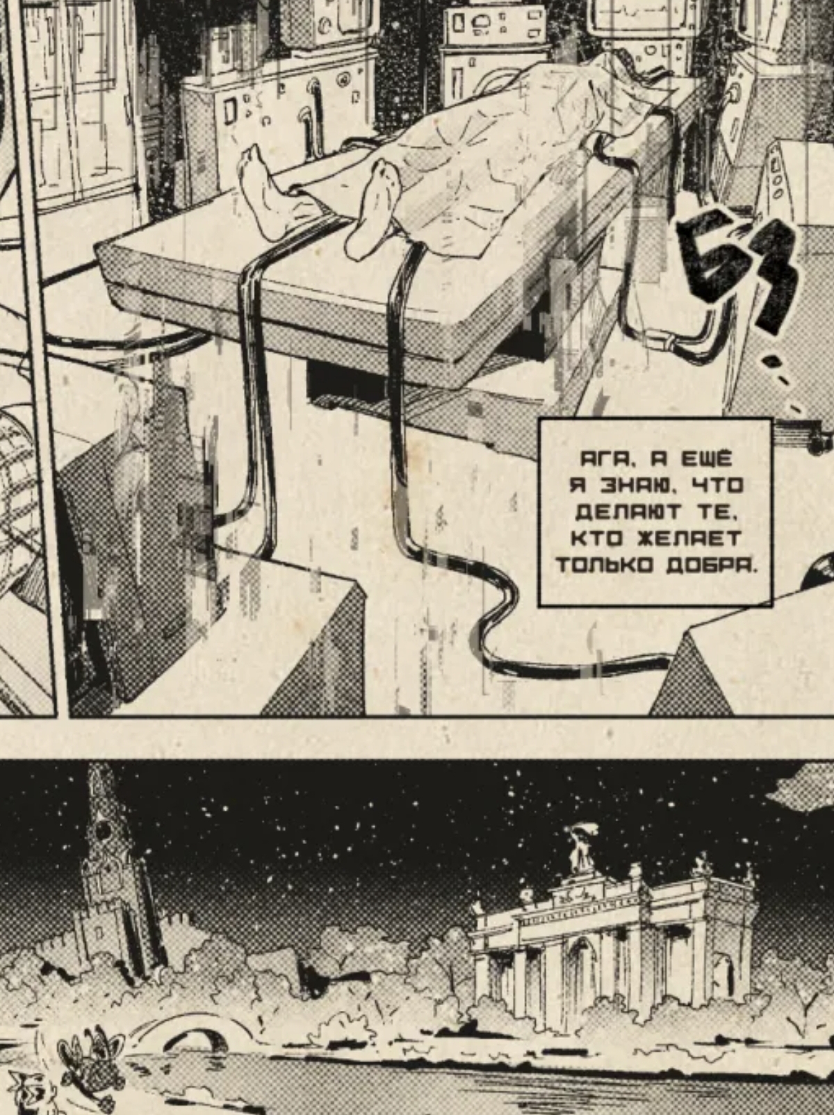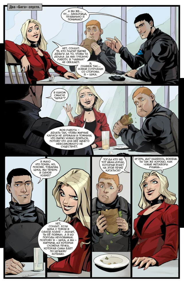 Хороший пример того, чем отличается любитель срисовывать фоточки от настоящих комиксистов вроде Васина и Пиксмилка. Отбираешь у Борнякова референсы и он начинает хуячить плоские рожи с перспективой в одну точку. Впрочем, рисунок и сценарий хорошо подходят друг другу своей дубовостью