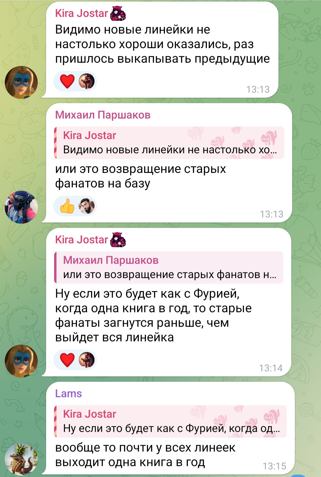>>1372886 >Но манга и вебтуны как раз серийные Это единые серии. Без дурацких кроссоверов и перезапусков. Открыл и читаешь, ничего больше не нужно >Бабл как бы пытался в румангу Привалова предложила мангу и как они сделали? Нашлось пара команд, они их просто издали и заплатили по тыще на нос. Всё. Охуенное развитие. Тот же ссаный Мир они годами тащили, хотя изначально было ясно, что это мертвая серия >>1372889 Возможно. Не могу сказать точно, но, может так оно и есть. Только у пузырей свои планы >>1372900 >Дык в Мертвецах под 193 выпуска в 32 тома с единной непрерывною сюжеткой от и до, в каком плане это "легче" читать чем серийную модель? Мертвецы взорвали рынок. Если б не бомбанули - не было бы этих 32 томов, сериалов и т.д. Опять же, это цельная серия с устоявшейся историей и персонажами. Вот я Мрака сейчас собираю и не хочу чтоб он кончался. Пусть пилят дальше, я только рад. Но, если они начнут делать кроссоверы и перезапуски - я как бы буду в курсе событий, а новые читатели тупо будут дезориентированы в сюжете >Собственно под это и был заточен МИГ с добавлением Грому новой напарницы и уведения всяких Разумовских да Рек в смежные линейки чтобы дать дорогу новым злодеям Сложно. Выглядит так, как будто они бездумно навалили кучу, не знают что с ней делать и начали разгребать. Я просто не хочу в это вникать. У меня есть время и деньги - может я лучше погоняю в новые игры, или посмотрю кинцо? >>1372903 Да, с авторским составом они обосрались. Сами по сути спилили сук на котором сидели >>1372905 Я не он, но вот Альпака сейчас нехуево выдает коллаборации с Пеховым и в целом идет в правильном направлении >>1372914 Опять же, я не он, но, с ходу - ШУВ, пантеон, Мрак, Страж, R значит Регресс. Советую смотреть в сторону Альпаки и Молота