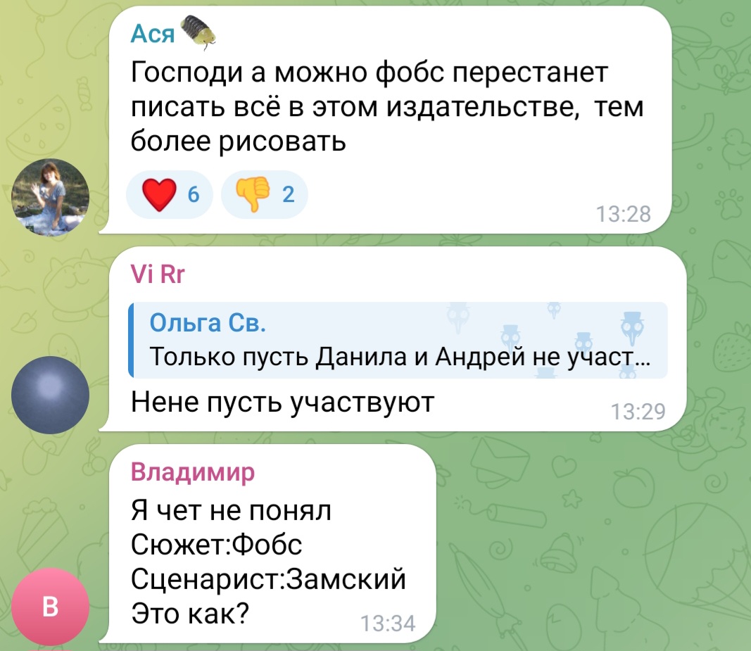 Послушал подкаст баблов по окончанию Мира. Как то уныло они рассказывали про все. Единственое что позабавило это оправдание Волкова про т.н. "поветрие среди читателей" что мир не прибыльный и поэтому был закрыт. Это неправда,все было прощитано еще в 2021, а не говорили потому что тогда читатели не покупали бы комикс если бы знали сколько будет томов. Вот как оказывается. Еще было любопытно узнать что они вдохновлялись Драгонболлом при создание сюжета с бункерами. А и что Стрелков изначально был придуман для фильма, а потом его добавили в комикс мир. И Стрелкова называют между собой "злым Замским". Больше вроде ничего интерестно.