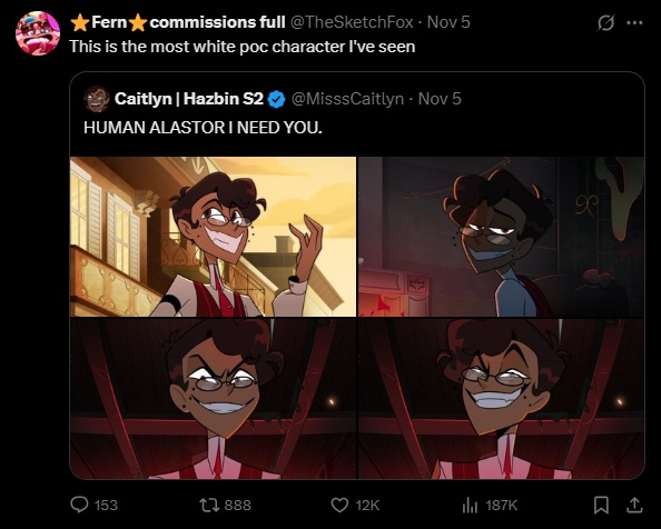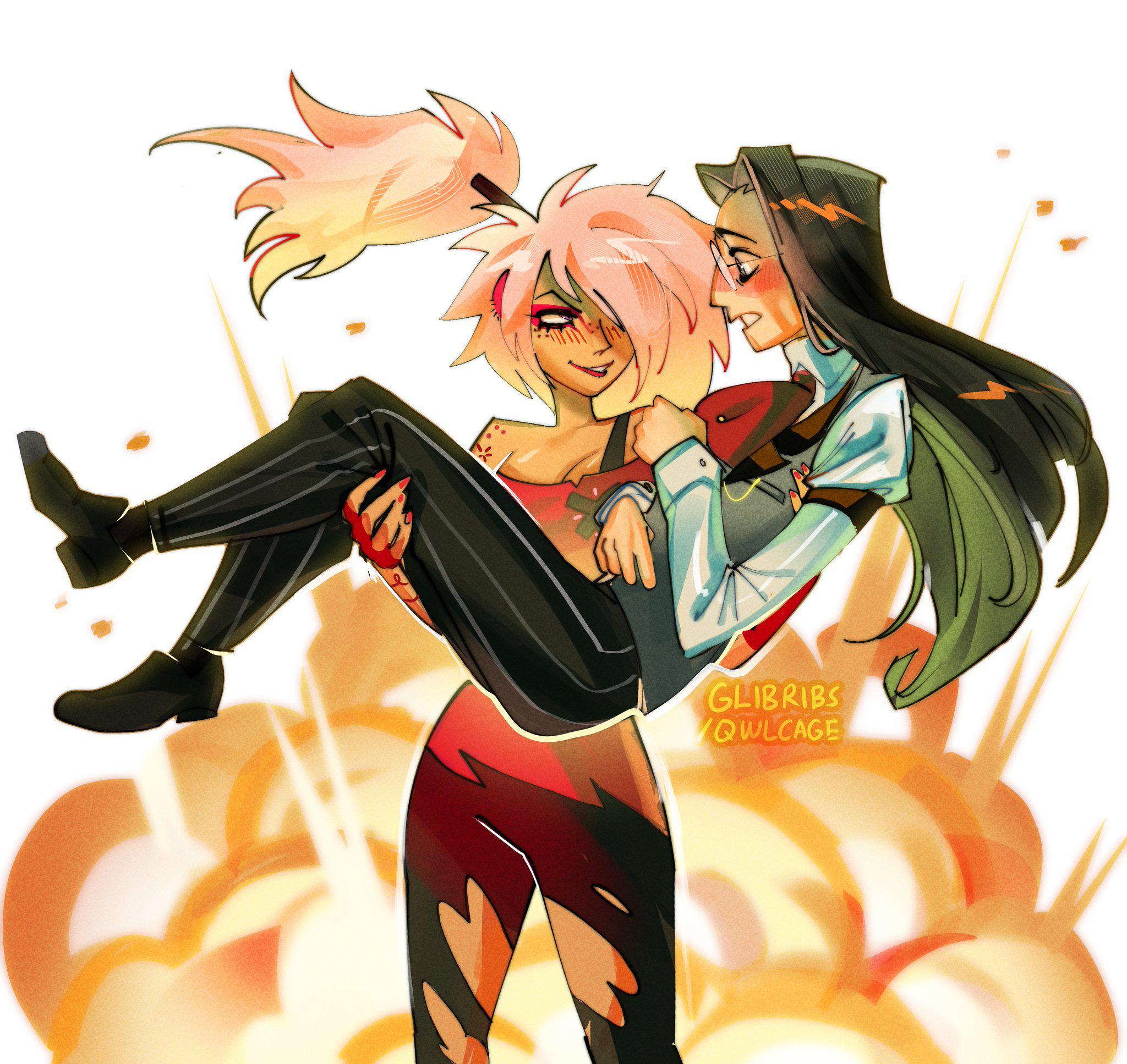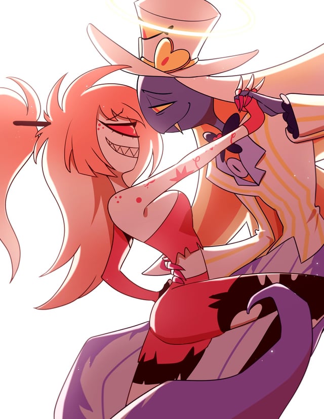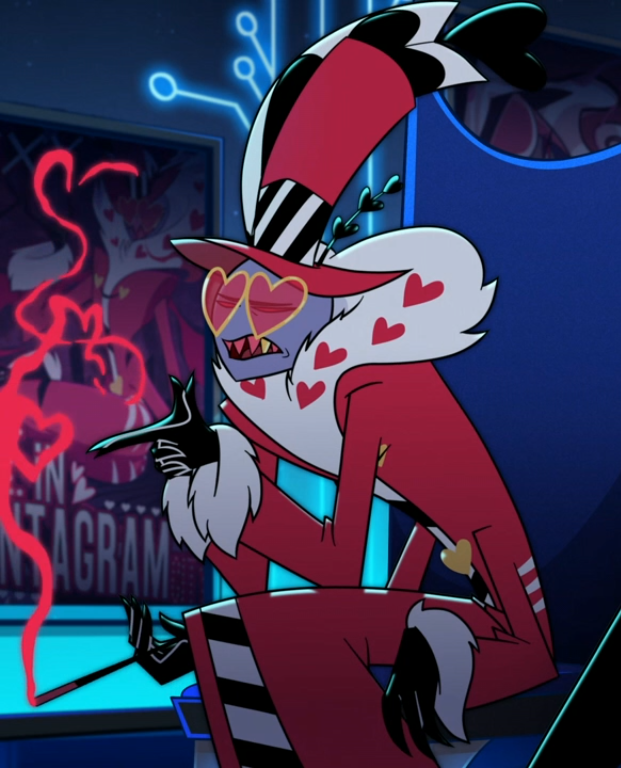 Аластор. Больше подходит на образ того самого Сатаны. Но Вивзи не знает, что с ним делать. В начале она его сделала социопатом-людоедом-асексуалом, и это норм. Но потом в духе твиттерской ебанашки она его сделала не аромантиком и добавила ему пару в виде Роззи...