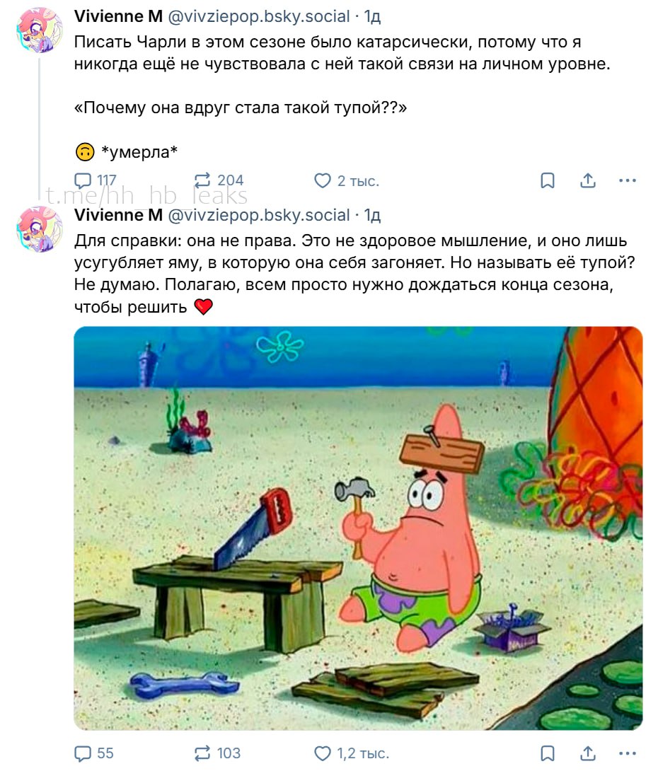 Ибо Чарли, которая за полгода не удосужилась хотя бы изучить труды макаренко или еще что-то, что помогло бы ей в перевоспитывании преступников разного уровня тяжели + за нее всё делают Вэгги, папка и Аластор, а она только похвалу получает в конце сезона - вот она уххх бля сильная героиня достойная восхищения (ну точно альтер эго вивзипоп, которая "самадобилась" при том что у нее был старт в виде родительских бабок и связей, она вообще инди креатором не может считаться). В качестве центральной героини мощнейший проеб, отбивающий желание дальше следить за ее историей