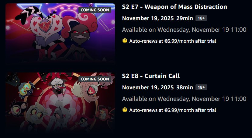Премьеры: 1. Helluva Boss. Mission: Zero — появится на ютуб-канале Вивзи 25 октября 2025 года (на Amazon Prime Video доступен с 10 сентября 2025 года). 2. Hazbin Hotel. Season 2 — 29 октября 2025 года на Amazon Prime Video будут показаны первые серии, а 19 ноября 2025 года — последние. Всего будет восемь серий, по две в неделю.