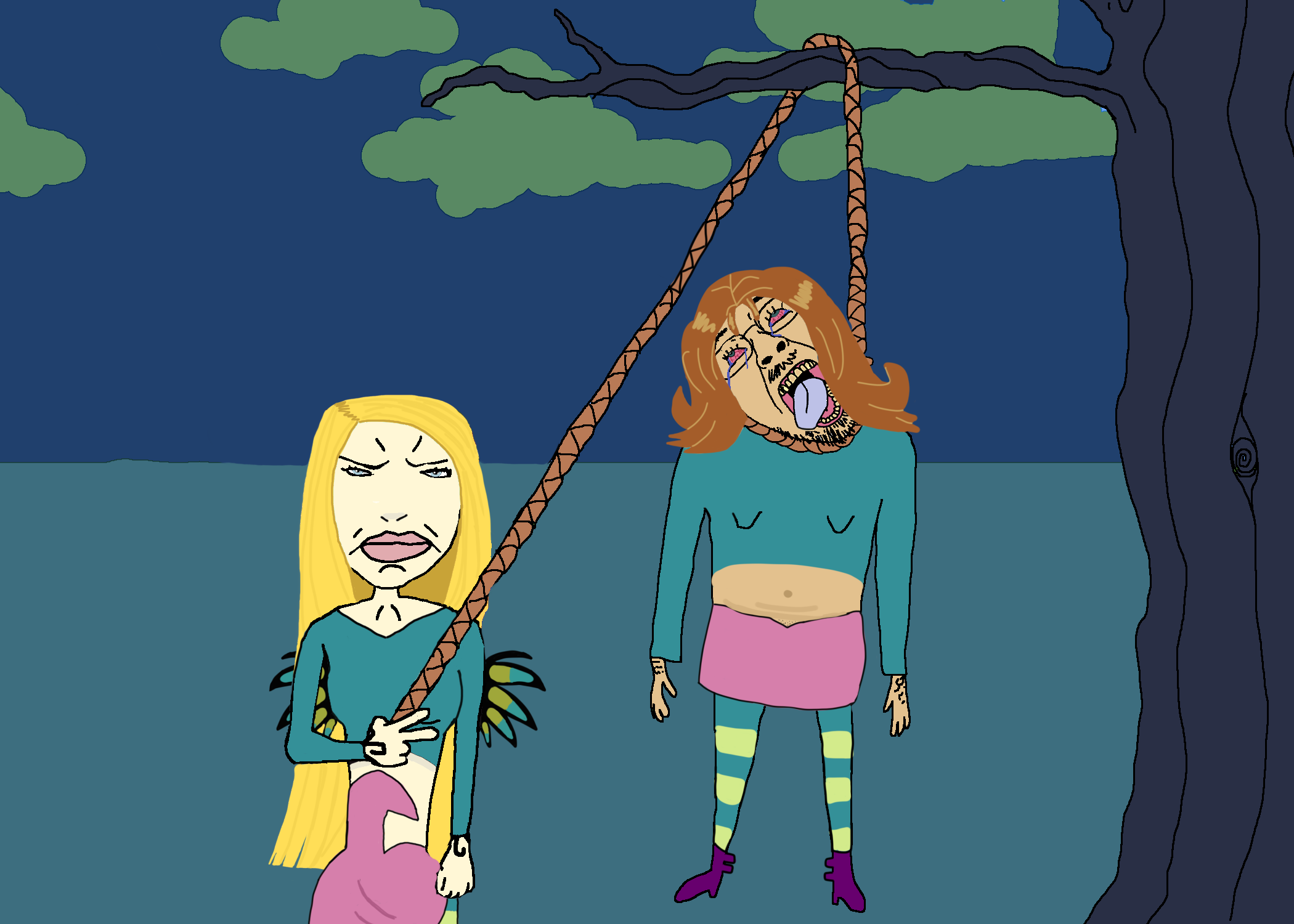 Корнелия пошла срать в тёмный лес. Вдруг за спиной послышался тихий шёпот: «Корнелия пошла срать…» Она замерла. Голоса становились всё ближе. Взгляд её заметил тень — не её отражение. Испугавшись, она повернулась — ни души. Но шёпоты продолжались: «Корнелия пошла срать… и больше не вернётся.»