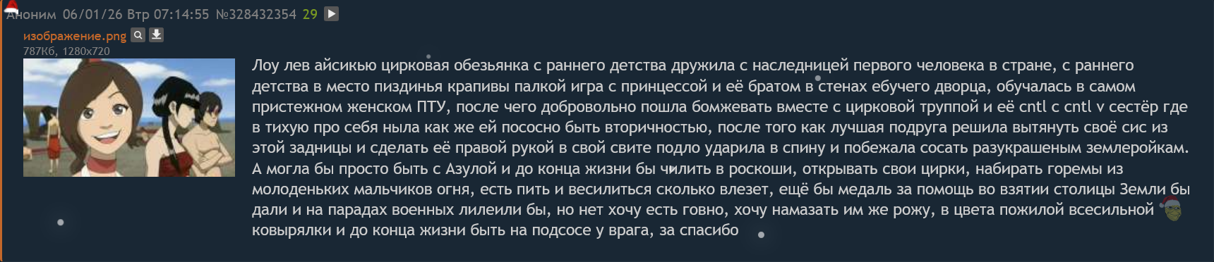 А прикиньте если у Азулы правда не момми ишуес а биг бро ишуес, и она всегда хотела братика большее чем брастко-сестрински, но сублимировала желания в свой перфекционизм.